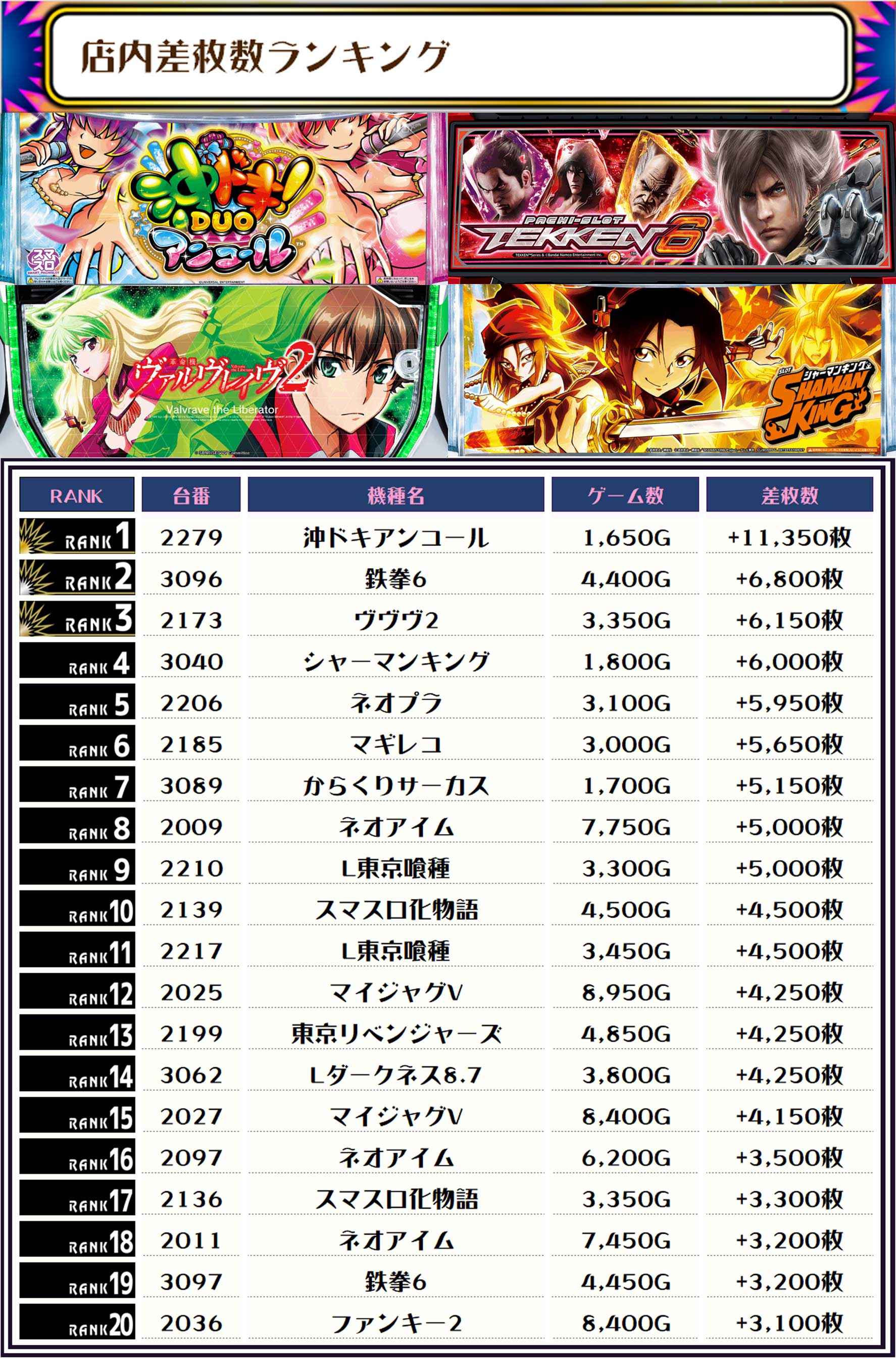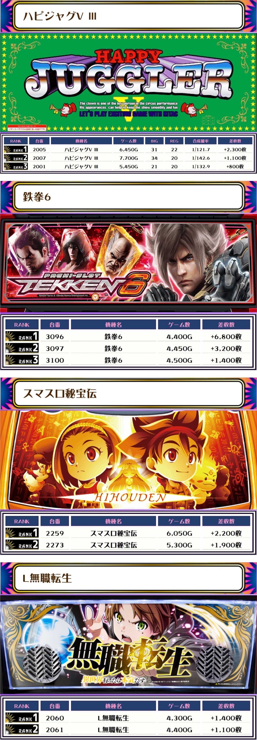 続く2位には【鉄拳6・3096番台】の+6,800枚、そして3位には【ヴヴヴ2・2173番台】の+6,150枚がランクインですっ❗️