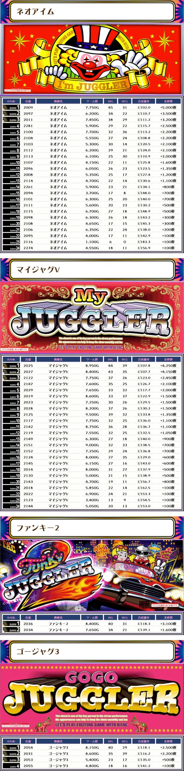 特にネオアイムとマイジャグⅤは優秀台が多かったみたいで、それぞれシマ単位で大幅プラス差枚となりました🎉