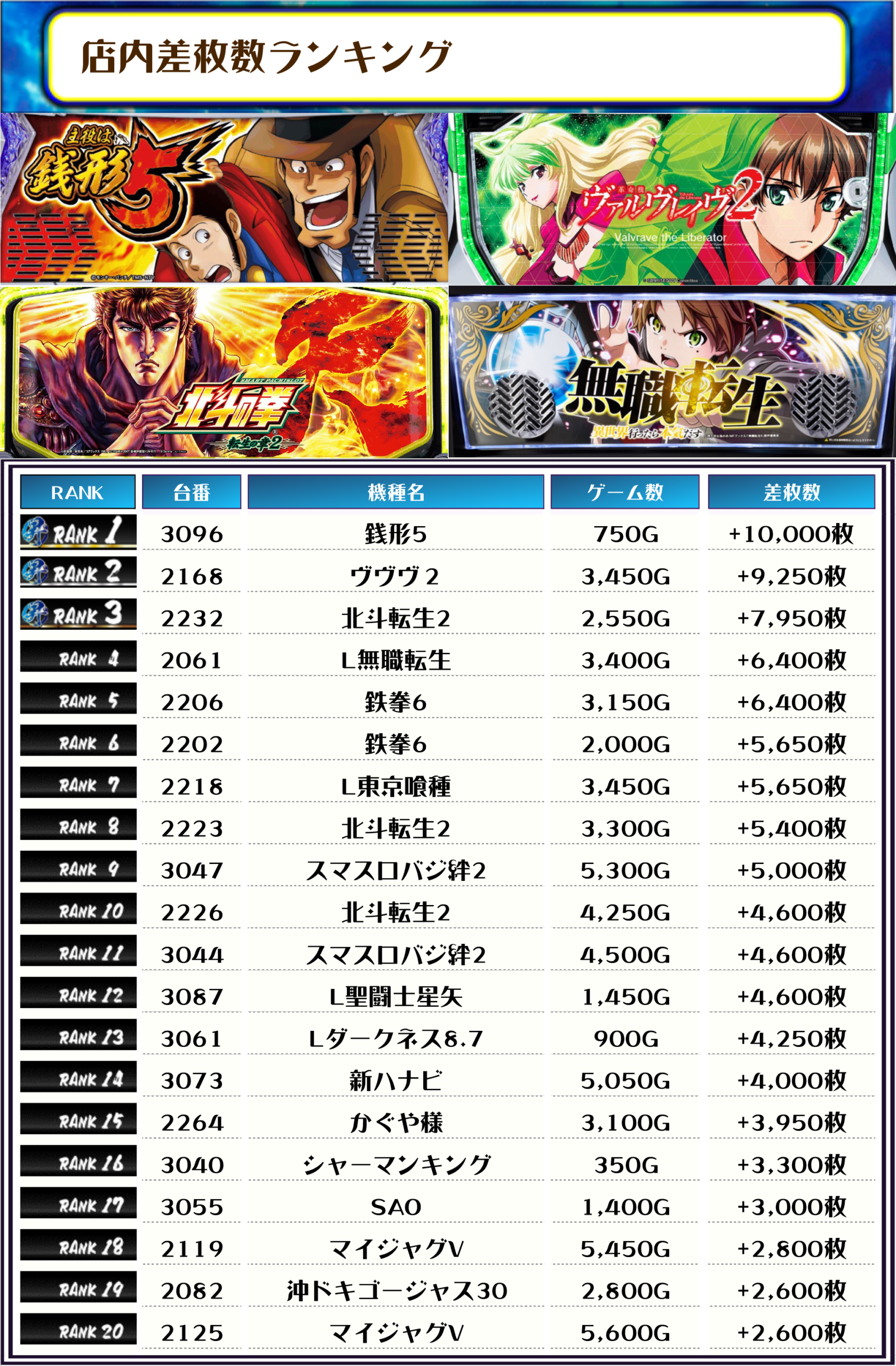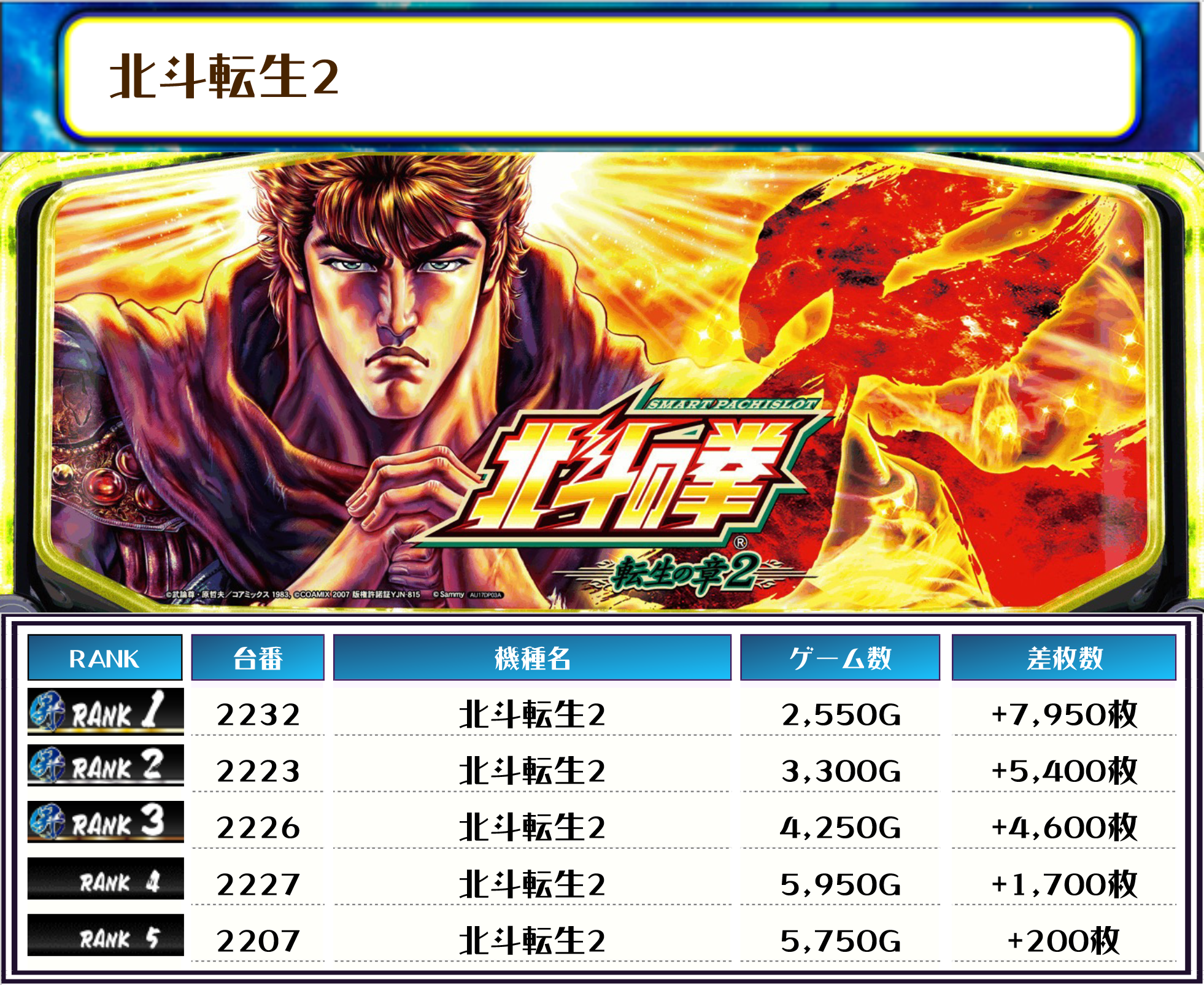 続く2位には【ヴヴヴ2・2168番台】の+9,250枚、そして3位には【北斗転生2・2232番台】の+7,950枚がランクインですっ❗️