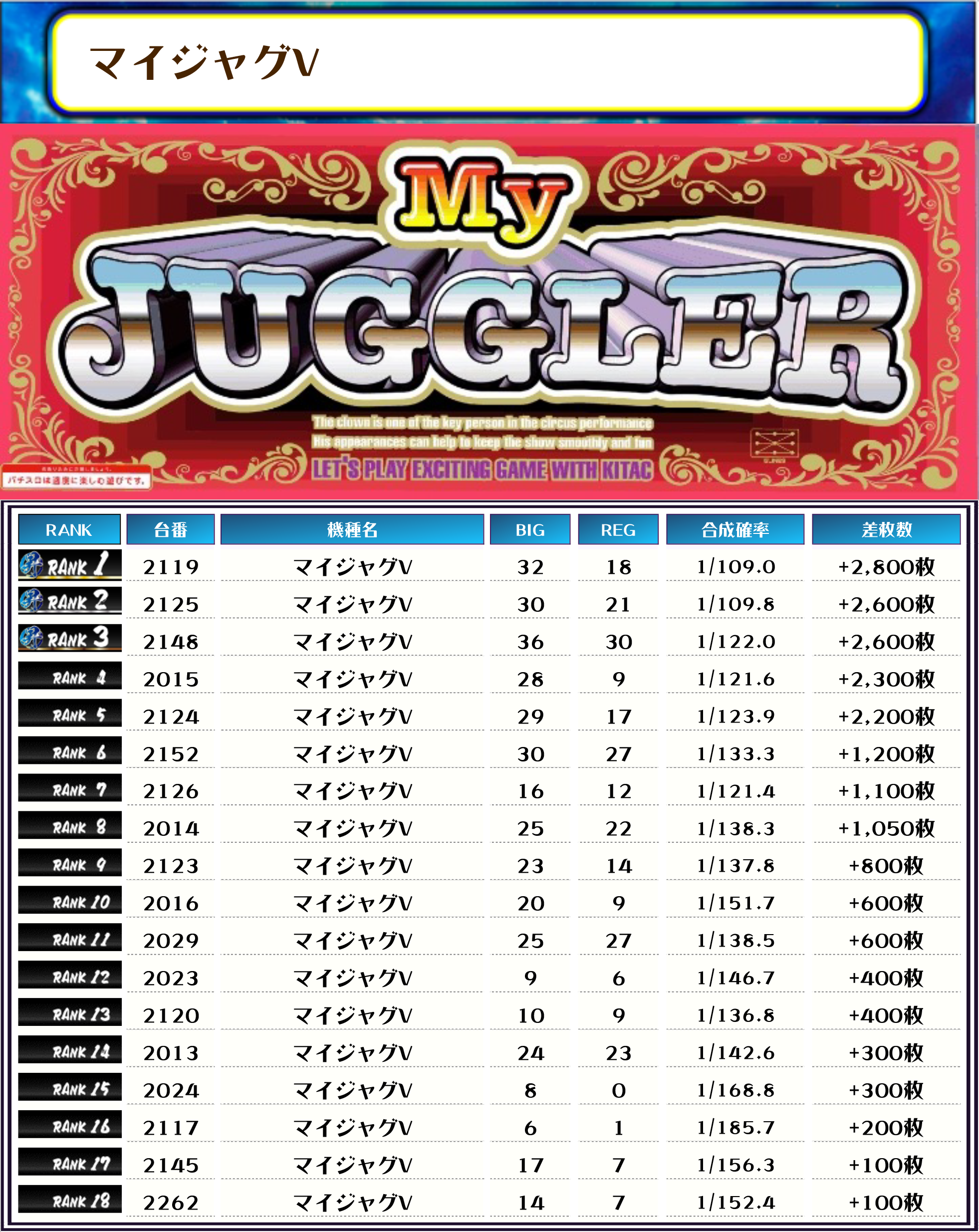 最後は、この日の店内差枚ランキングです❗️