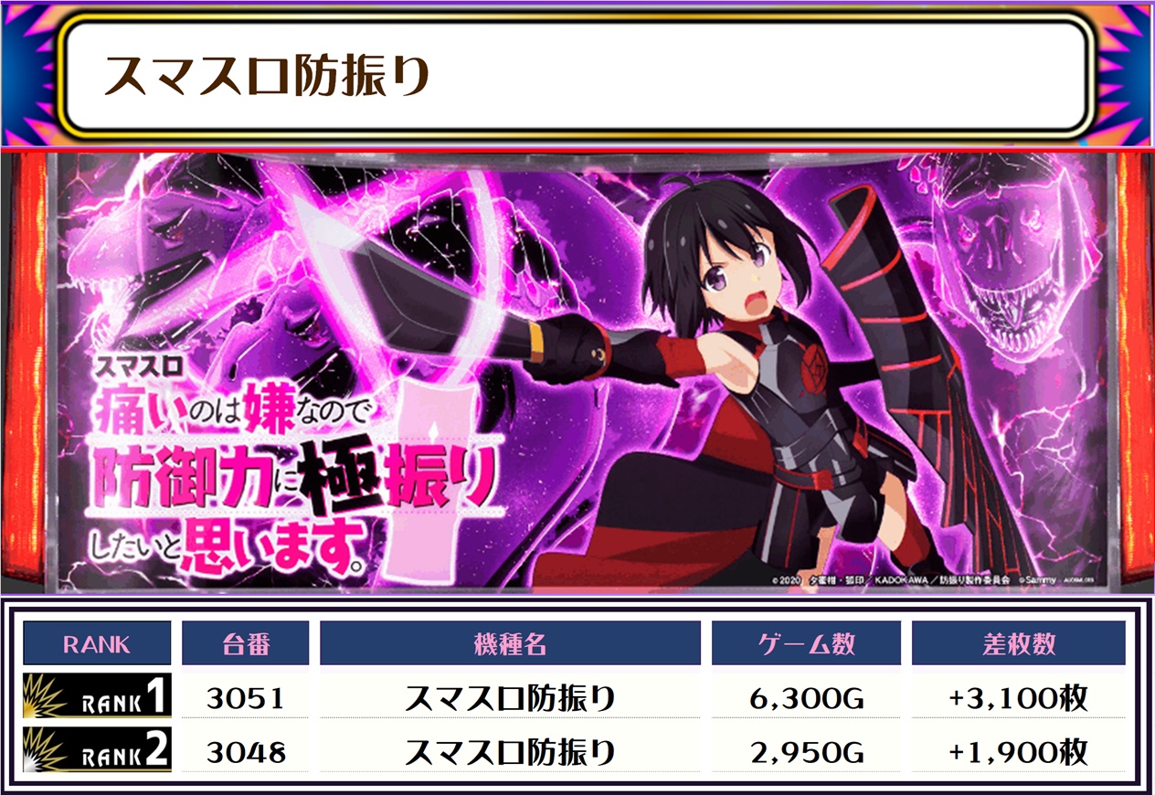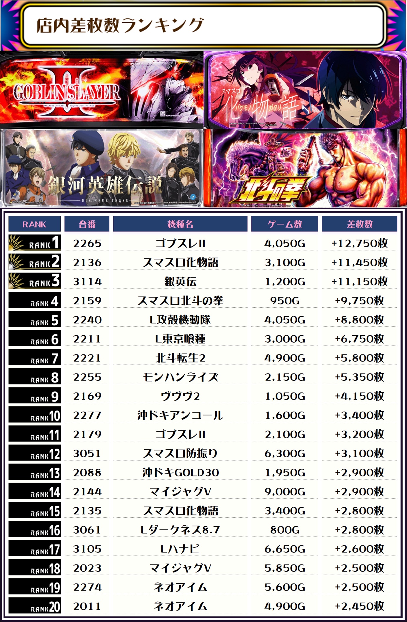 続く2位には【スマスロ化物語・2136番台】の+11,450枚、3位は【銀英伝・3114番台】の+11,150枚がランクインですっ❗️