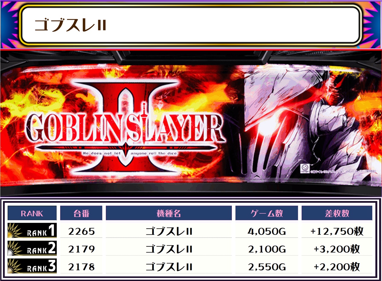 全体のTOP差枚は【ゴブスレII・2265番台】で差枚は+12,750枚を獲得っ❗️