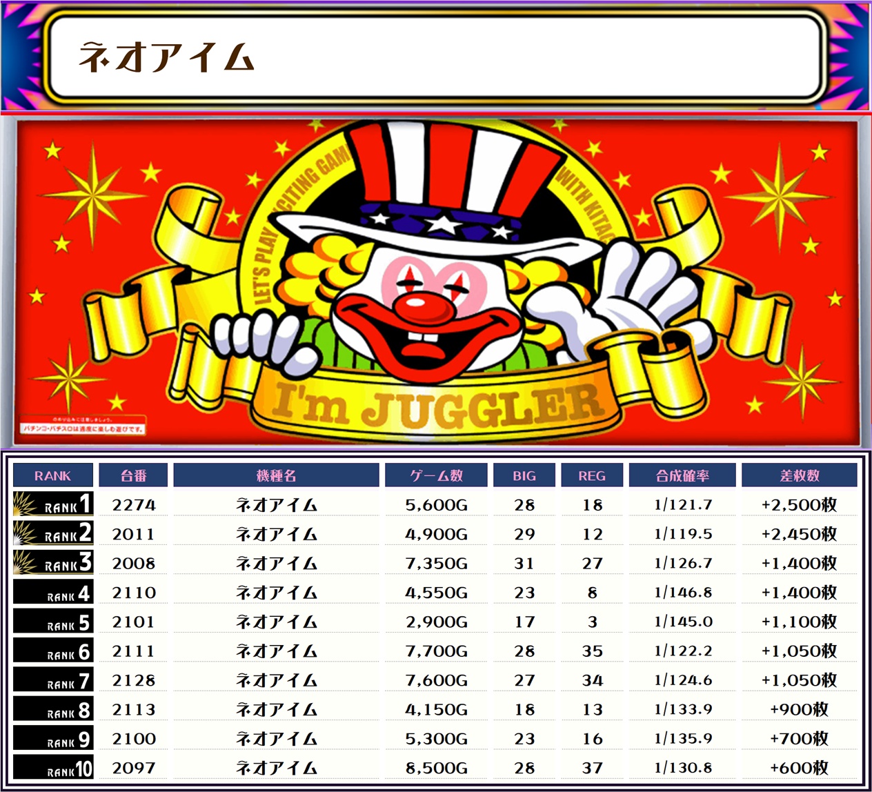 ランキングにマイジャグVやネオアイムが複数ランクイン🔥🔥🔥マイジャグは43台中22台がプラス、ネオアイムも33台中17台がプラスと優秀な結果となりました👏👏👏