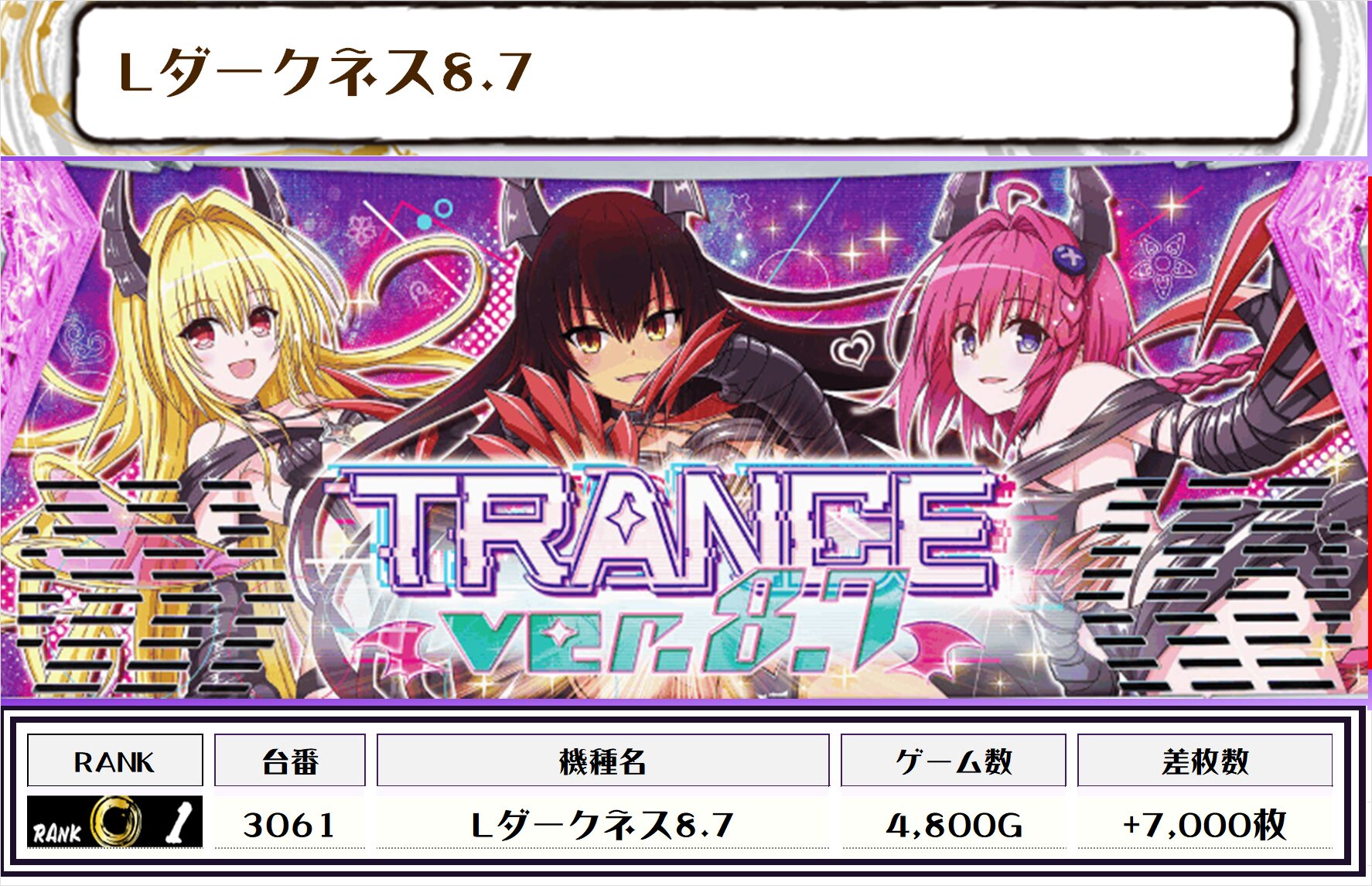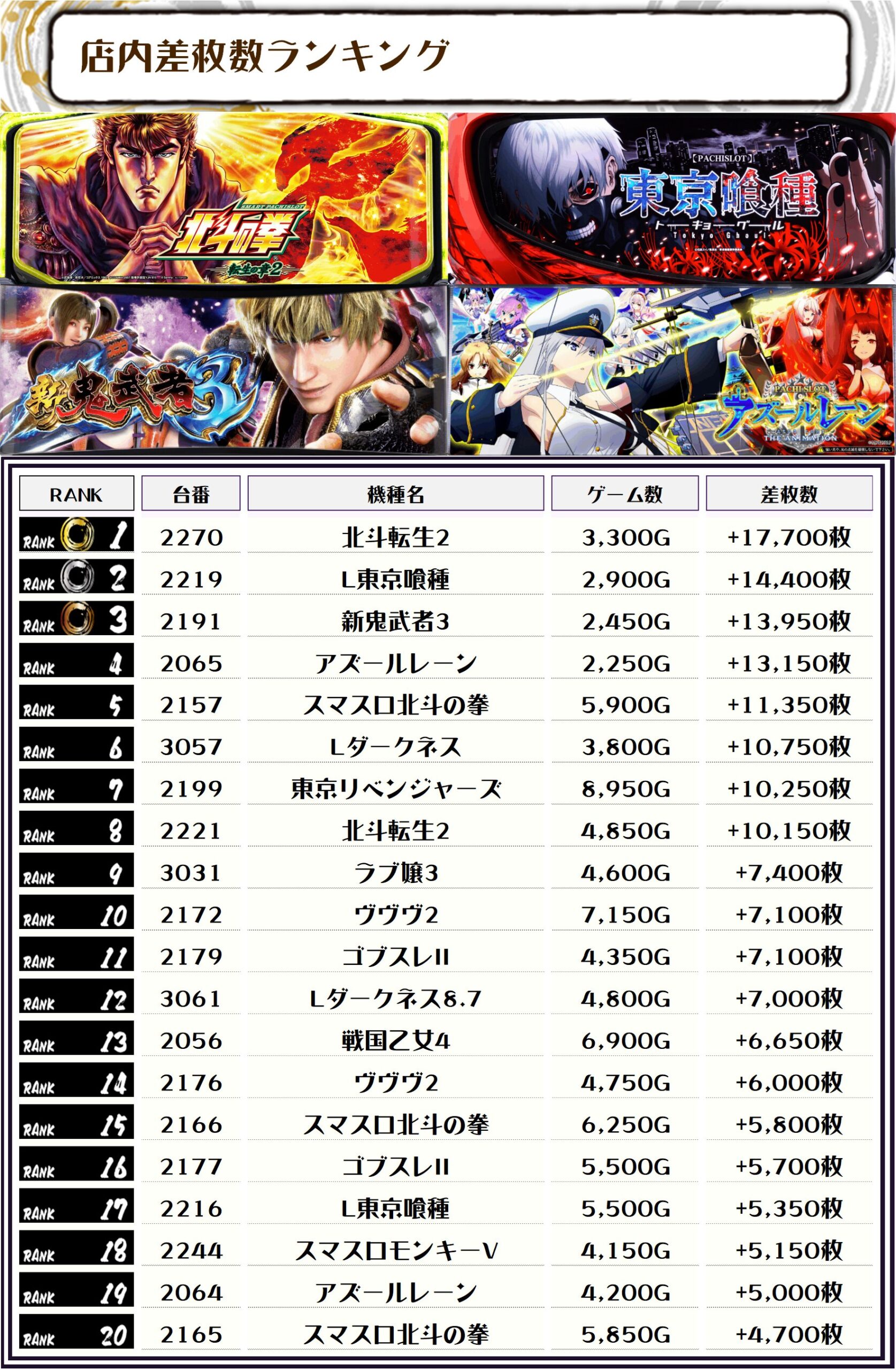 2位には【L東京喰種・2219番台】の+14,400枚、そして3位には【新鬼武者3・2191番台】の+13,950枚がランクインですっ🏆