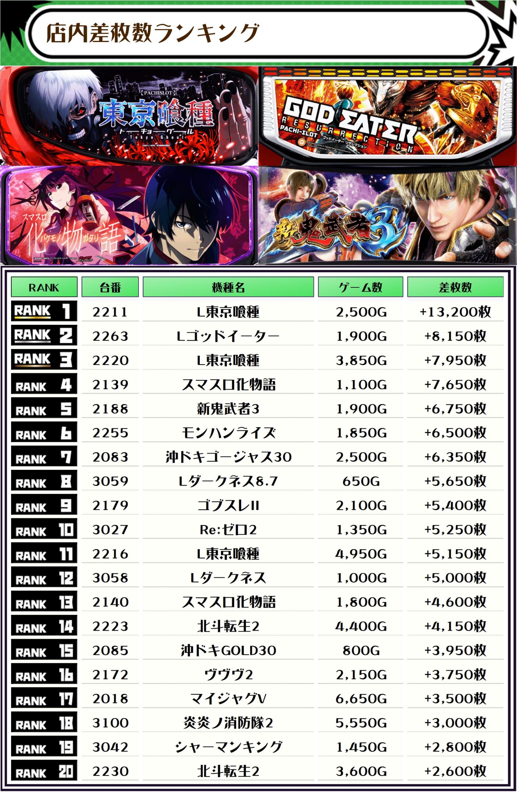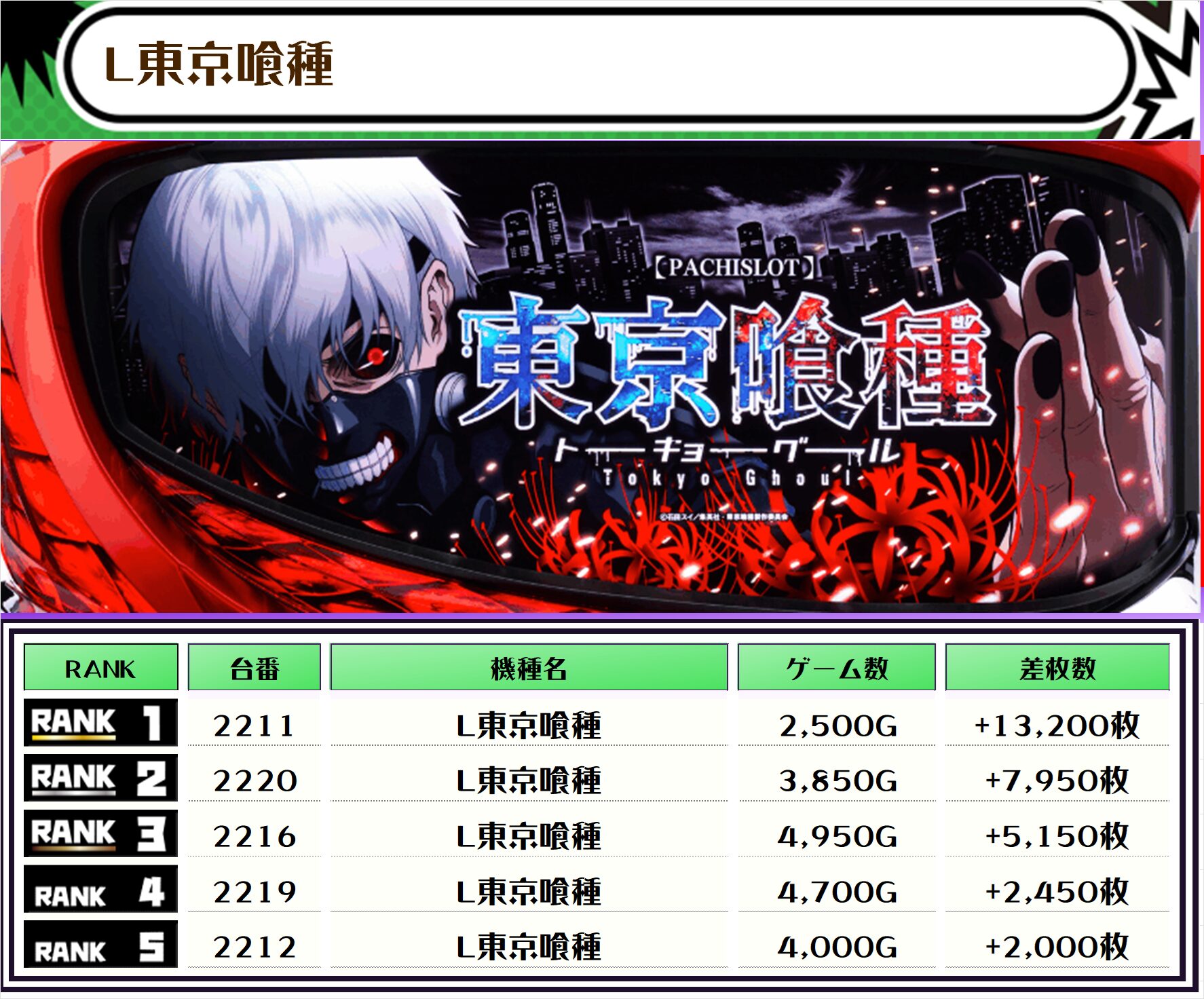 この日、全体の差枚トップに輝いたのは【L東京喰種・2211番台】で+13,200枚‼️