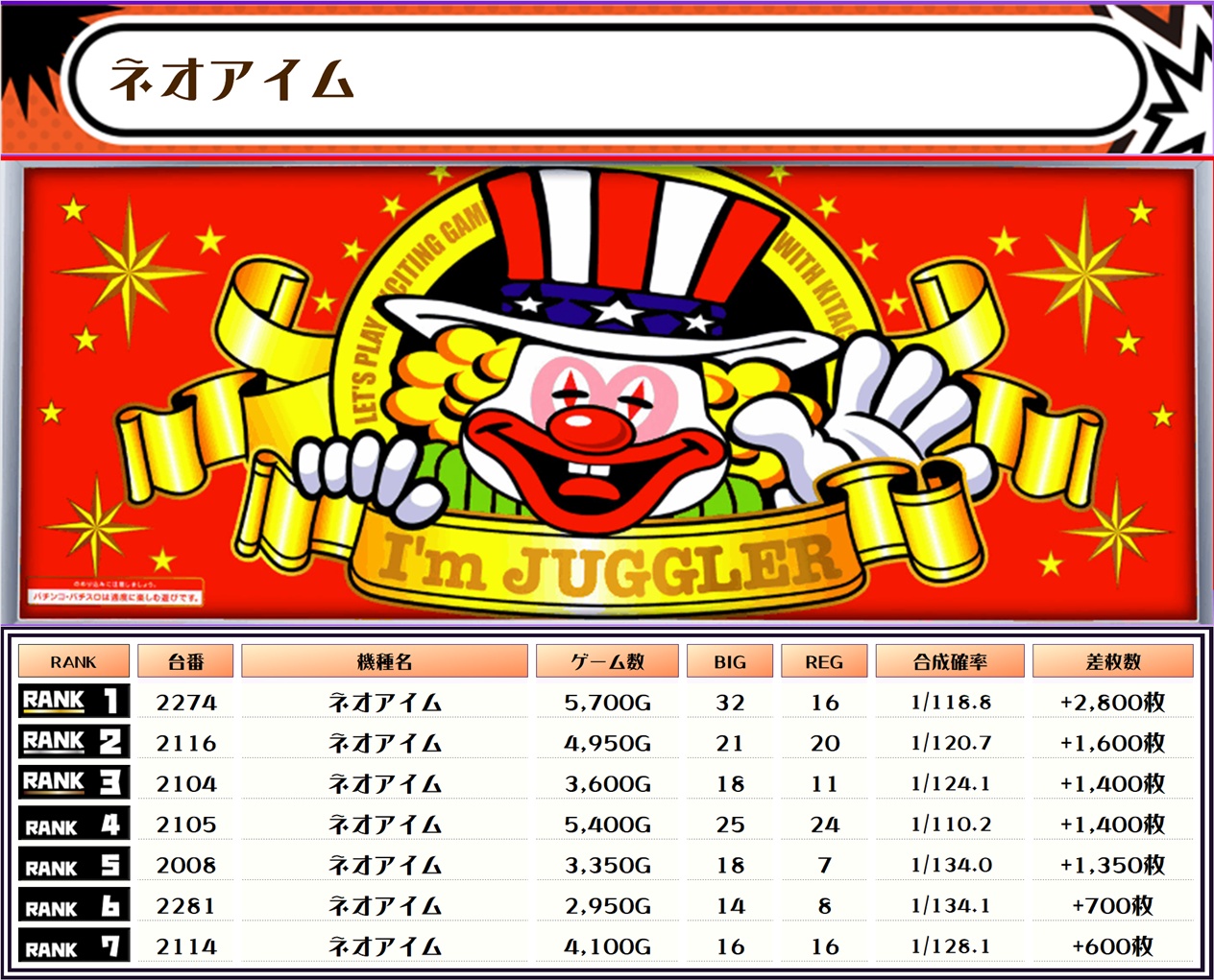 そして、全体の差枚ランキングはコチラっ📷