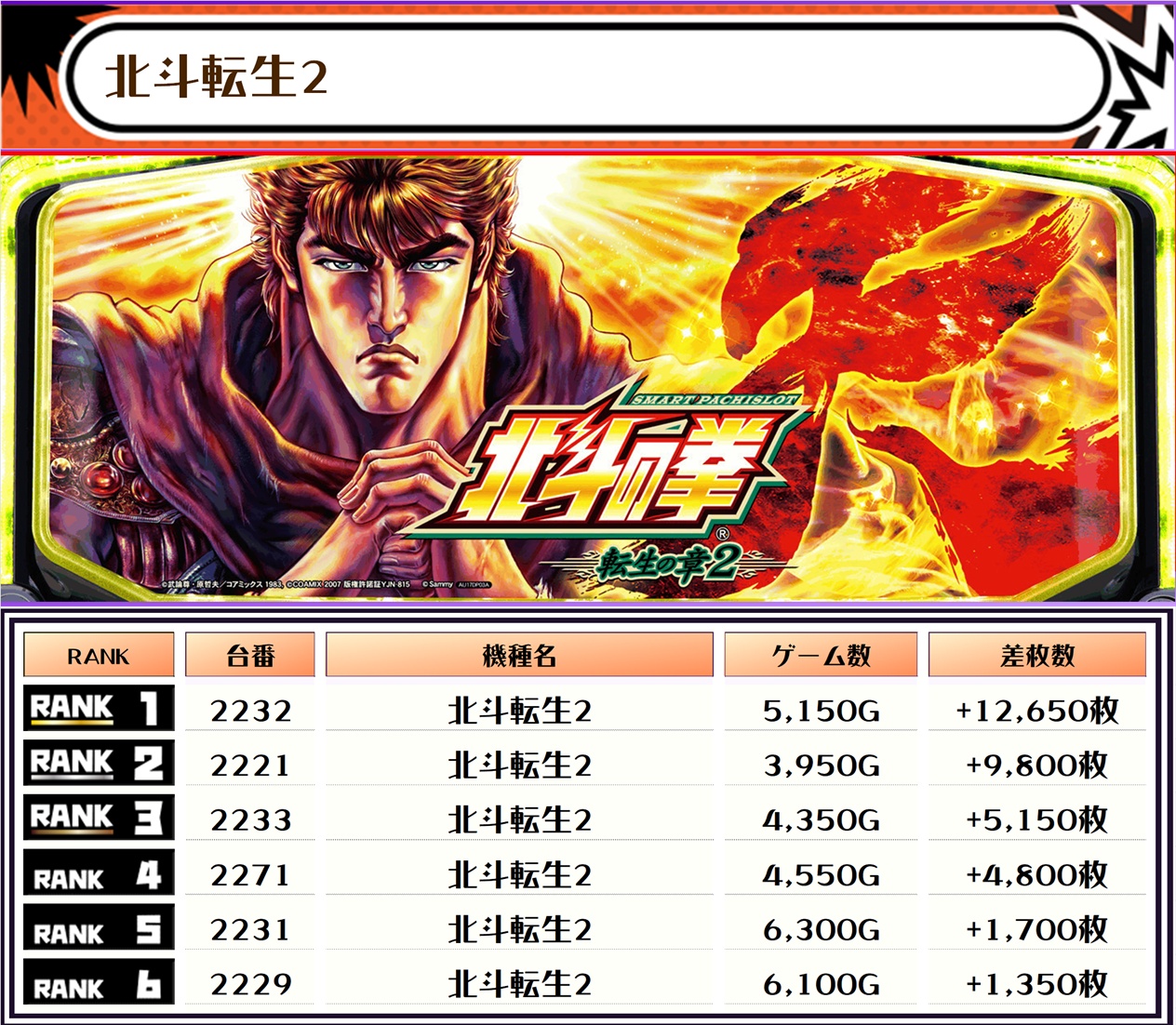 この日、全体差枚トップに輝いたのは【北斗転生2・2232番台】で+12,650枚っ🔥🔥🔥