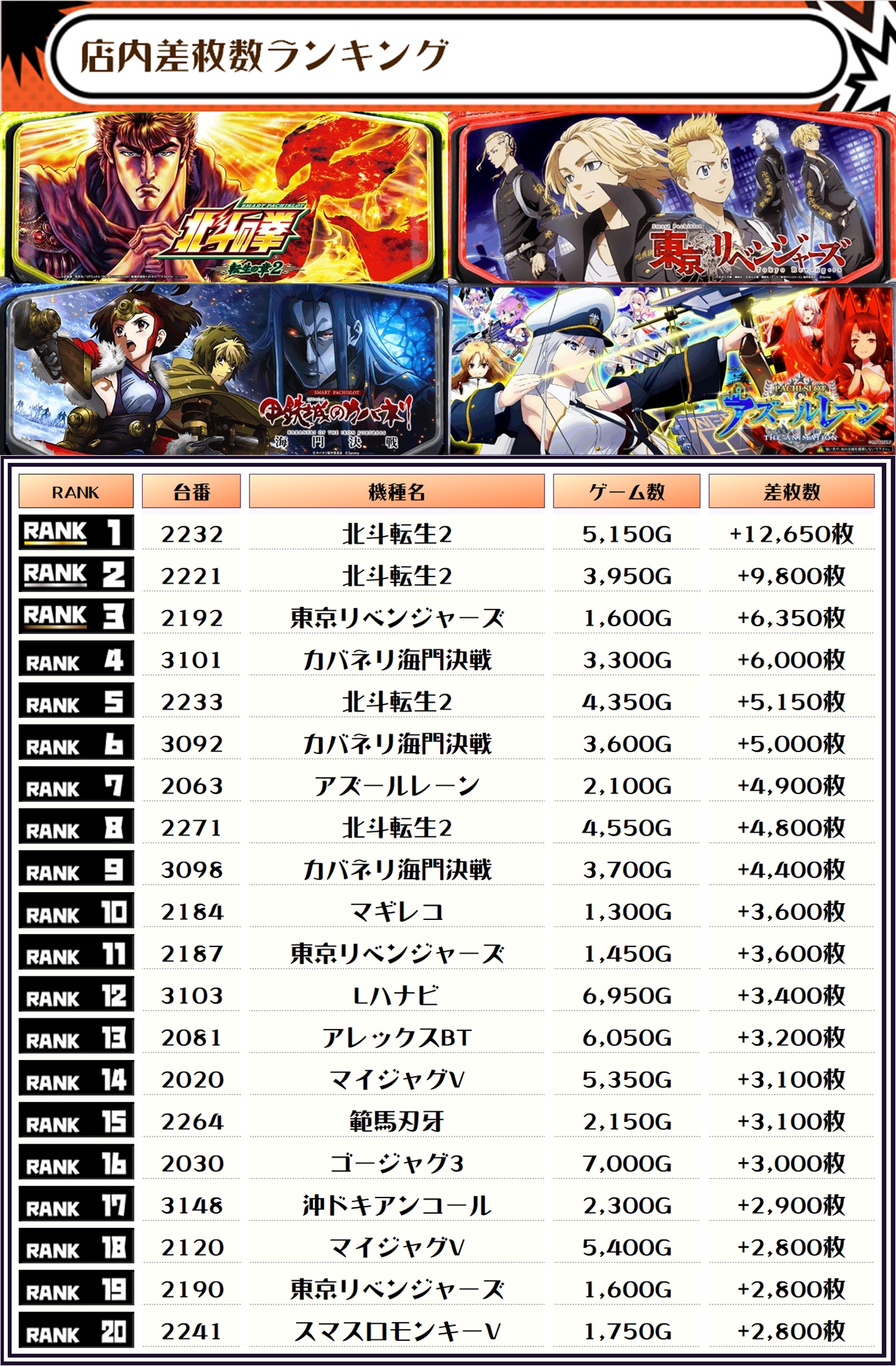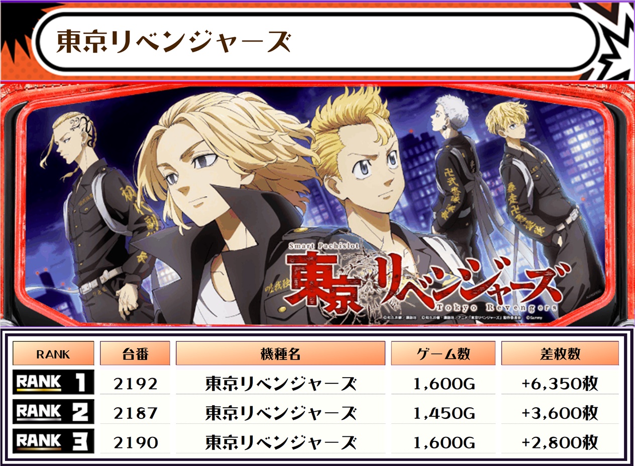 2位には【北斗転生2・2221番台】の+9,800枚、そして3位には【東京リベンジャーズ・2192番台】が+6,350枚でランクインっ✨