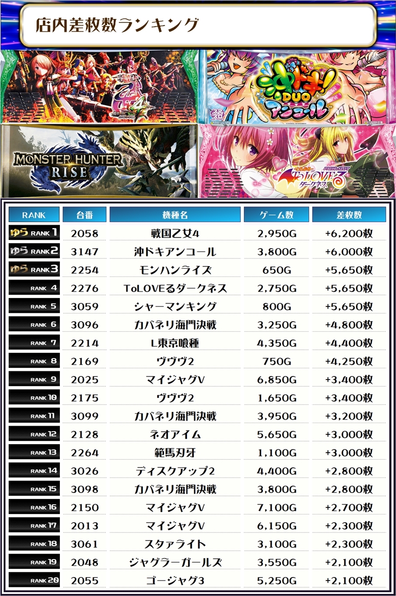 2位には【沖ドキアンコール・3147番台】の+6,000枚、そして3位には【モンハンライズ・2254番台】の+5,650枚がランクインっ🏆🏆🏆