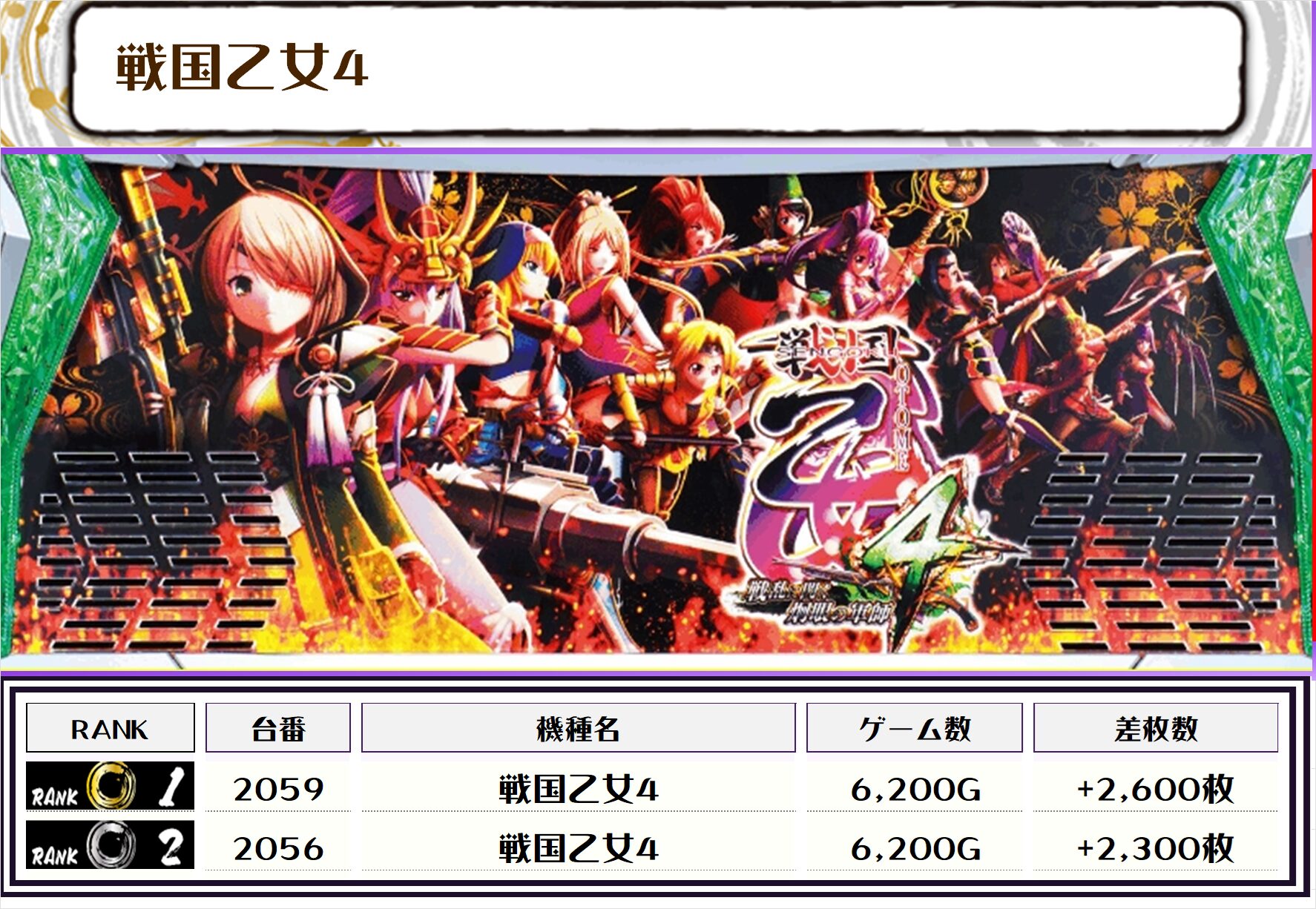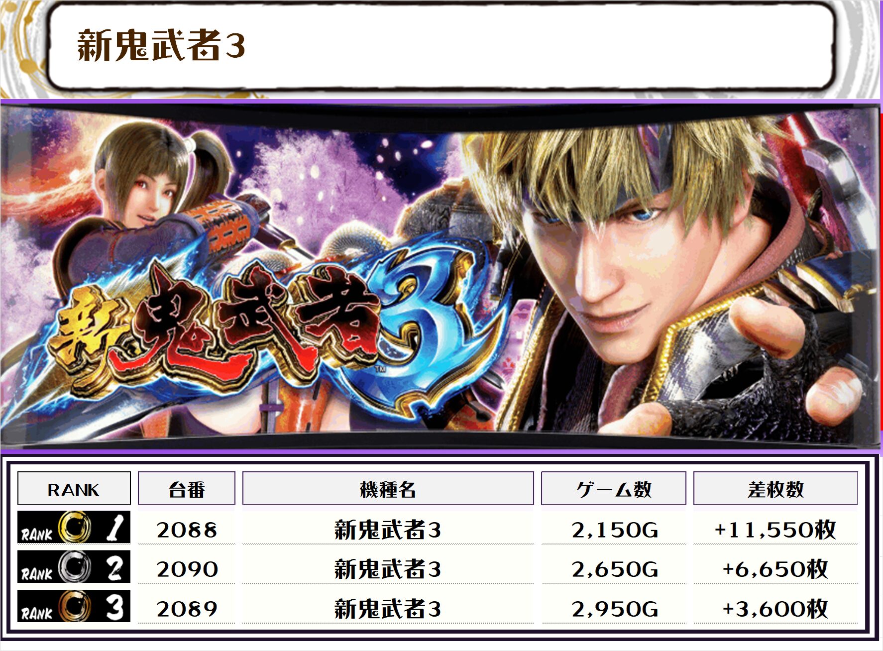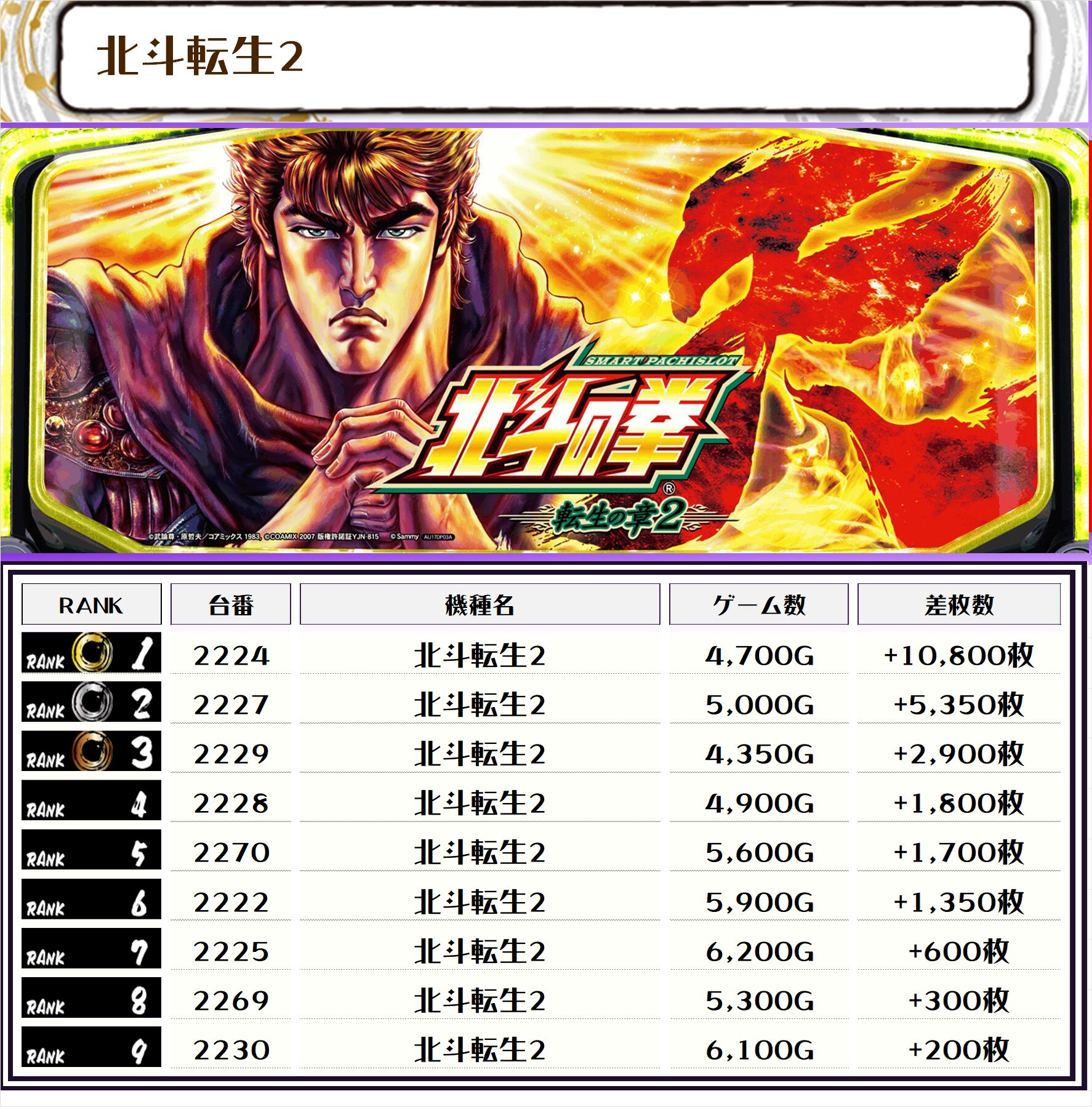 2位には【新鬼武者3・2088番台】の+11,550枚、そして3位には【北斗転生2・2224番台】の+10,800枚がランクインですっ🏆