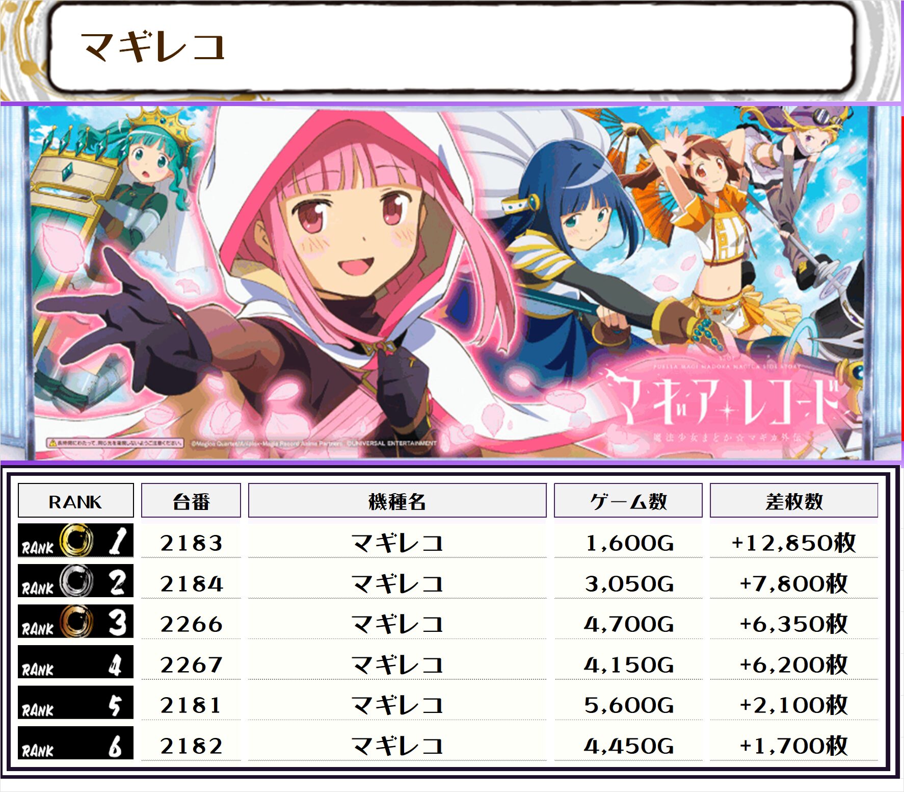 この日、全体の差枚トップに輝いたのは【マギレコ・2183番台】で+12,850枚‼️