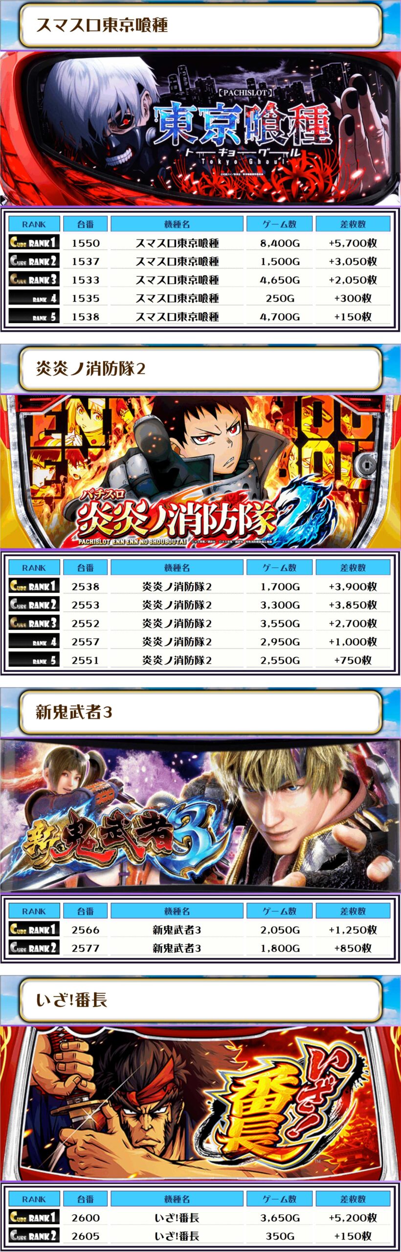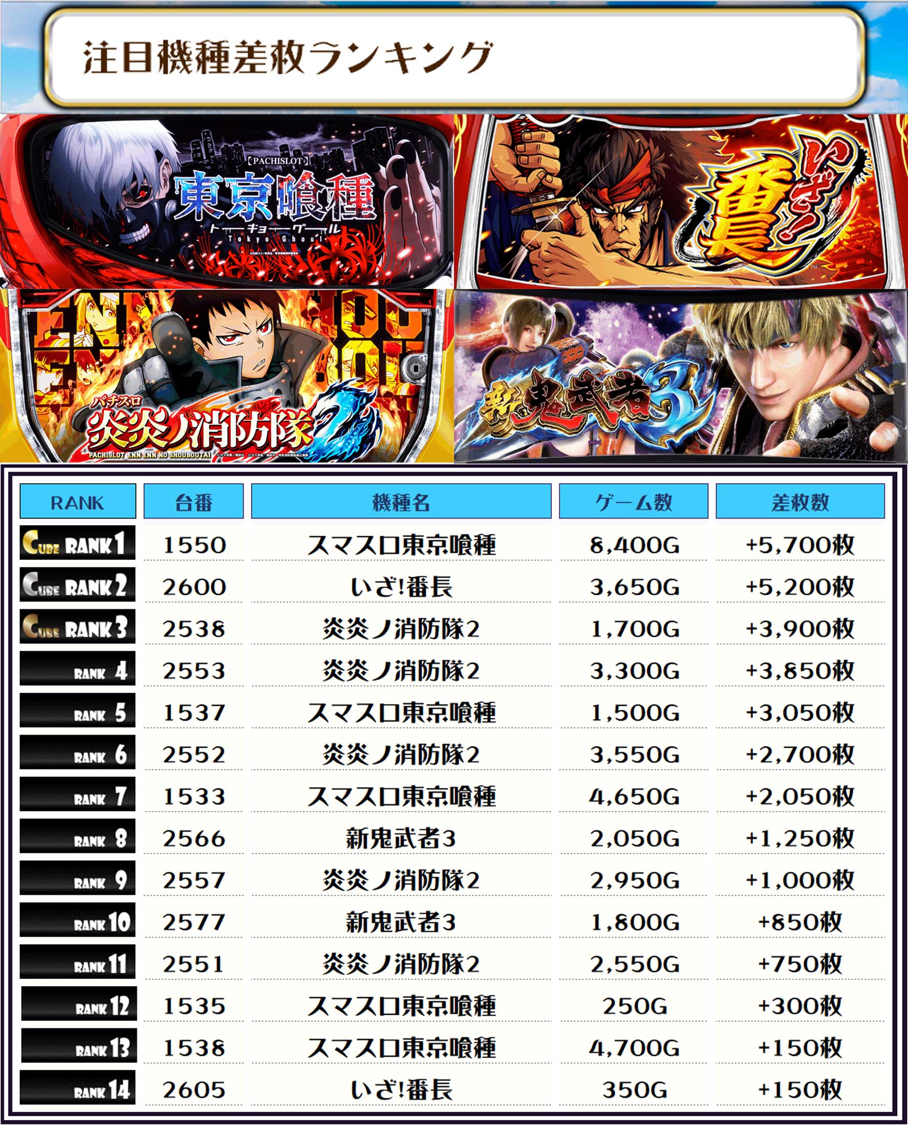 続く2位には【いざ!番長・2600番台】の+5,200枚、そして3位には【炎炎ノ消防隊2・2538番台】の+3,900枚がランクインっ✨
