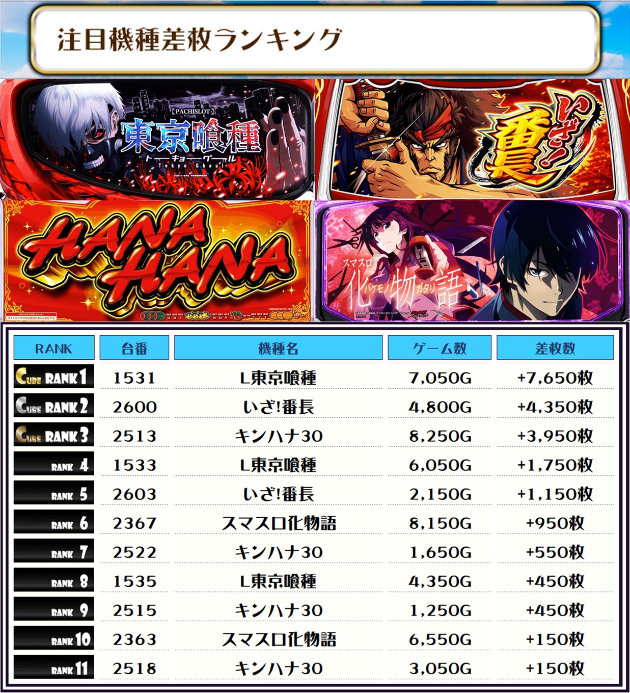 さあ、この日、取材で僕が気になった機種の【差枚ランキング】を見ていくでやんすっ❗️