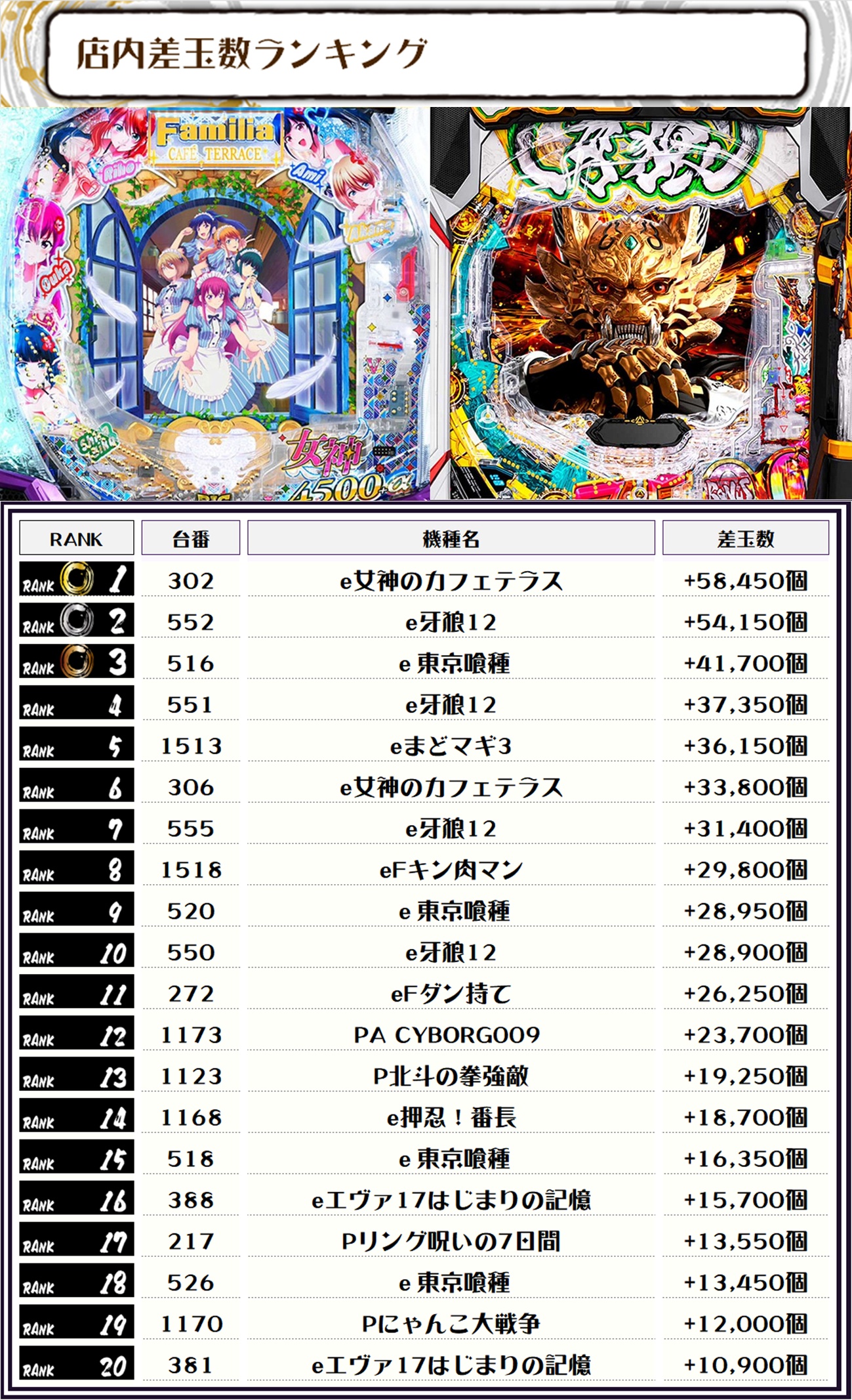 出玉TOPは【e女神のカフェテラス・302番台】で+58,450発👍
