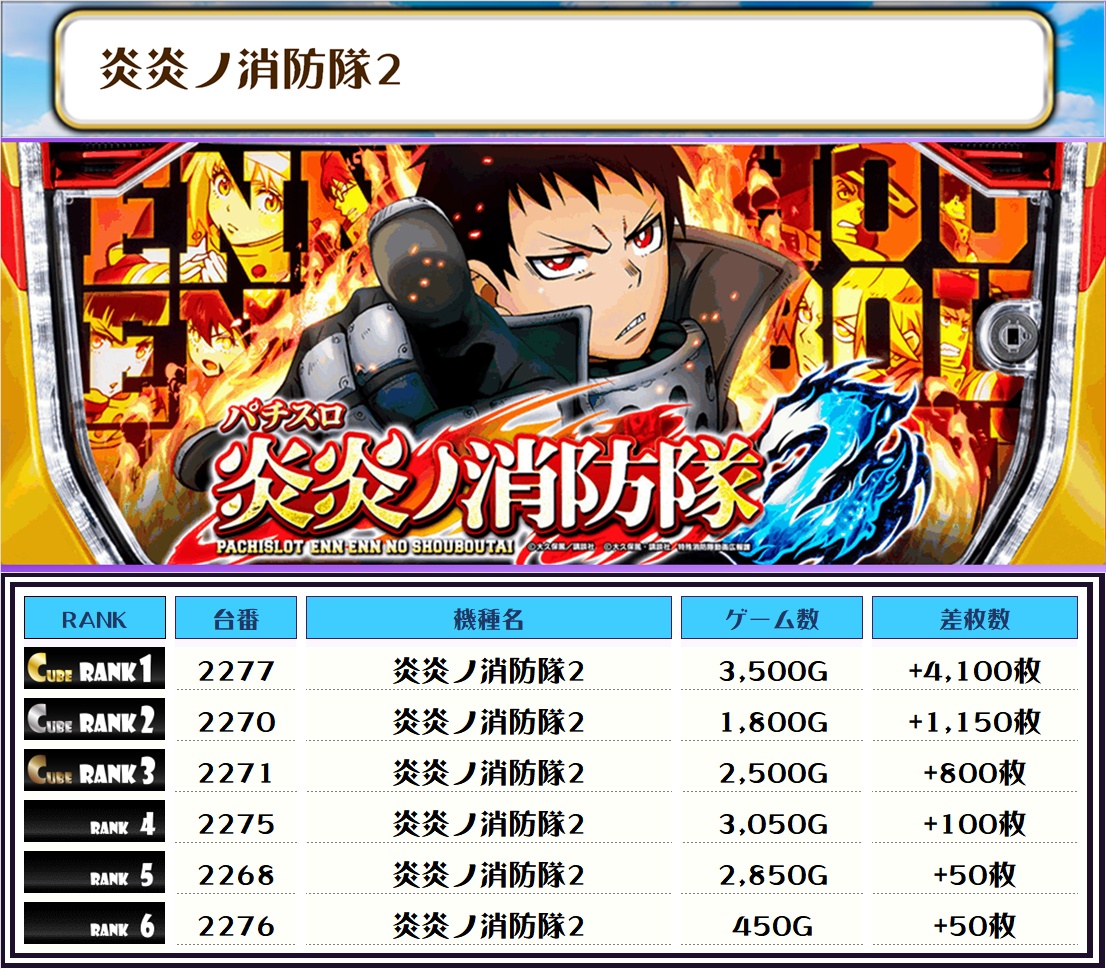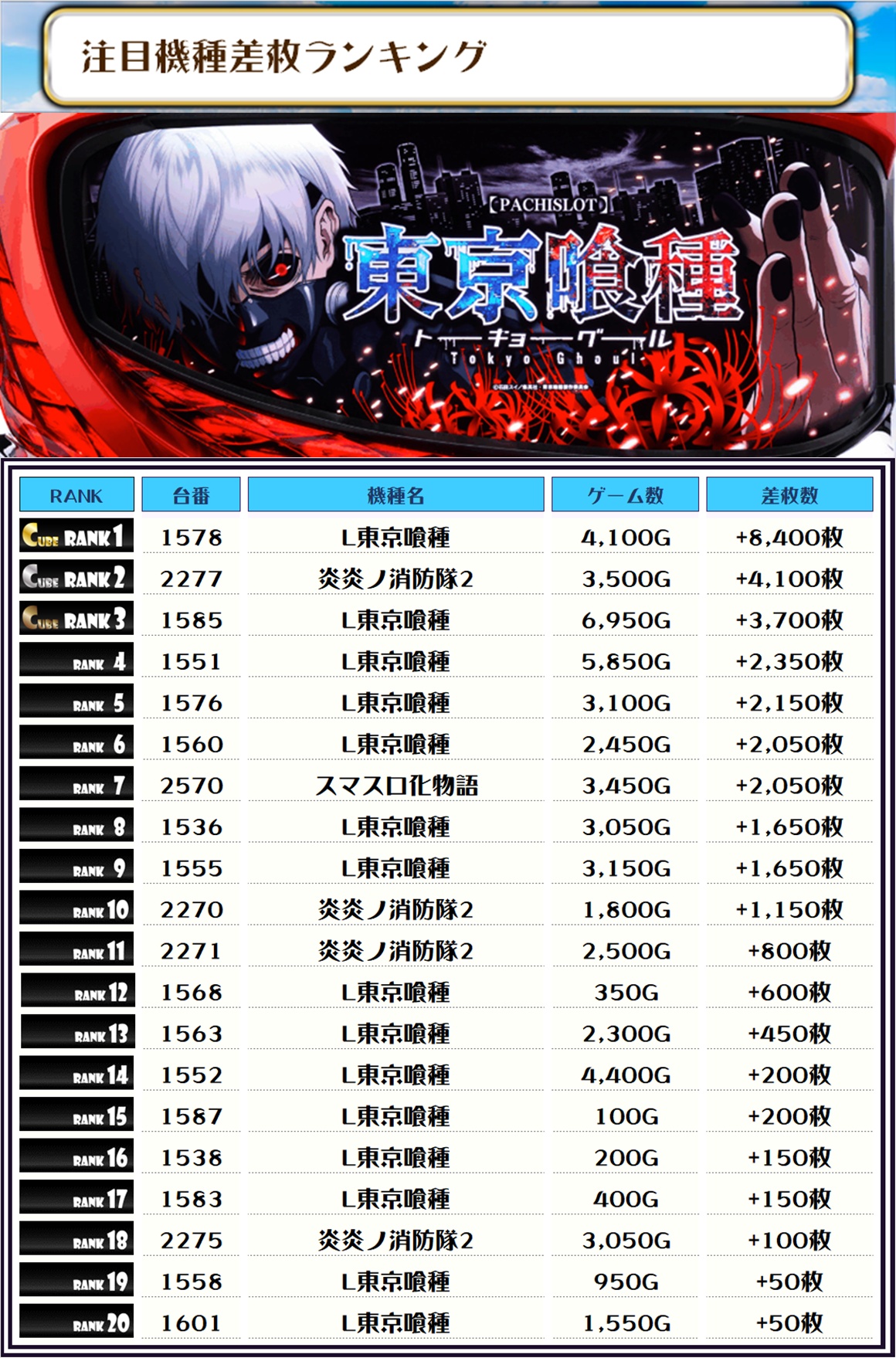 続く2位には【炎炎ノ消防隊2・2277番台】の+4,100枚、そして3位には1位と同じく【L東京喰種・1585番台】の+3,700枚がランクインっ✨