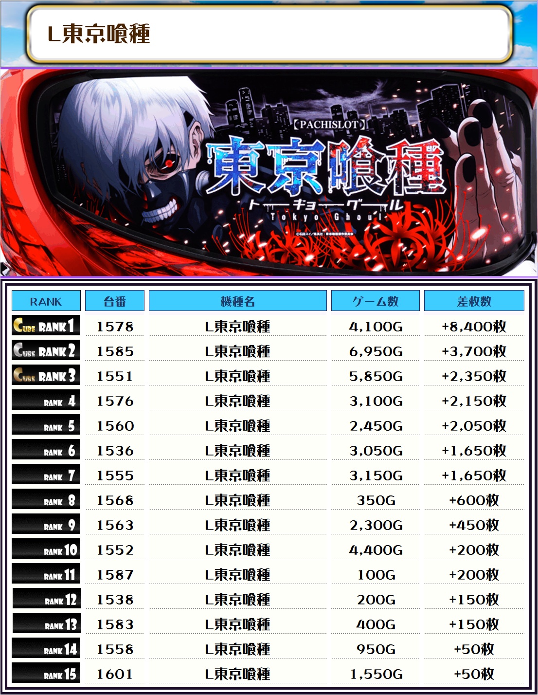 差枚トップの成績を残したのは【L東京喰種・1578番台】で+8,400枚👑👑👑