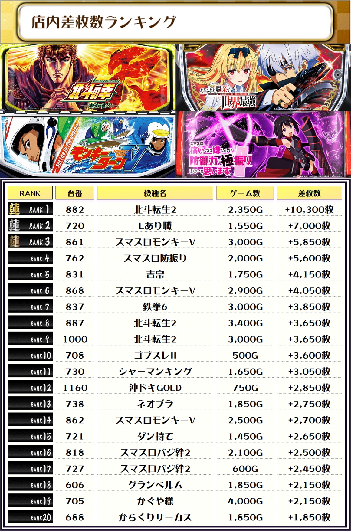 最後に、この日の店内差枚ランキングをご覧ください❗️