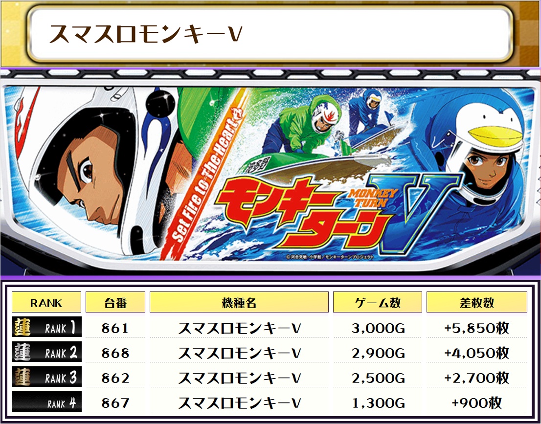 続く2位には【Lあり職・720番台】の+7,000枚、そして3位には【スマスロモンキーV・861番台】の+5,850枚がランクインっ🏆🏆🏆🏆