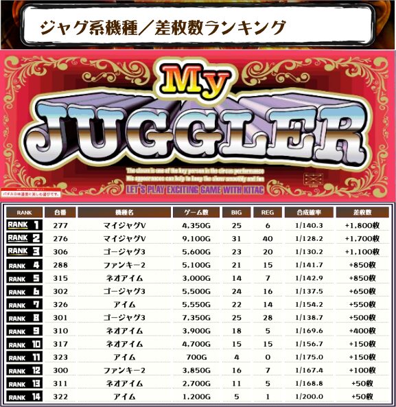 全体のTOP差枚は【マイジャグV・277番台】で+1,800枚👍