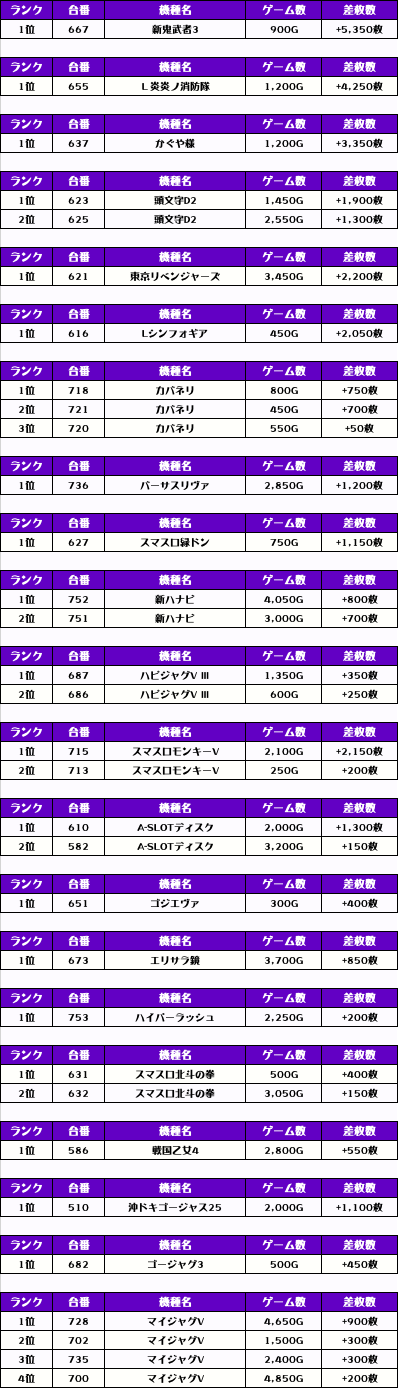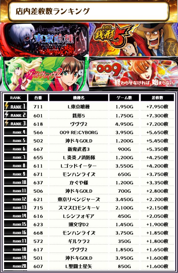 続いては【店内全台の差枚ランキング】をご覧ください!