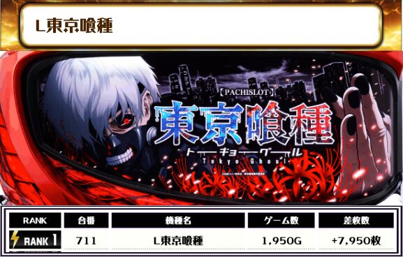 ということで、この日の全体差枚トップは【L東京喰種・711番台】で+7,950枚‼️