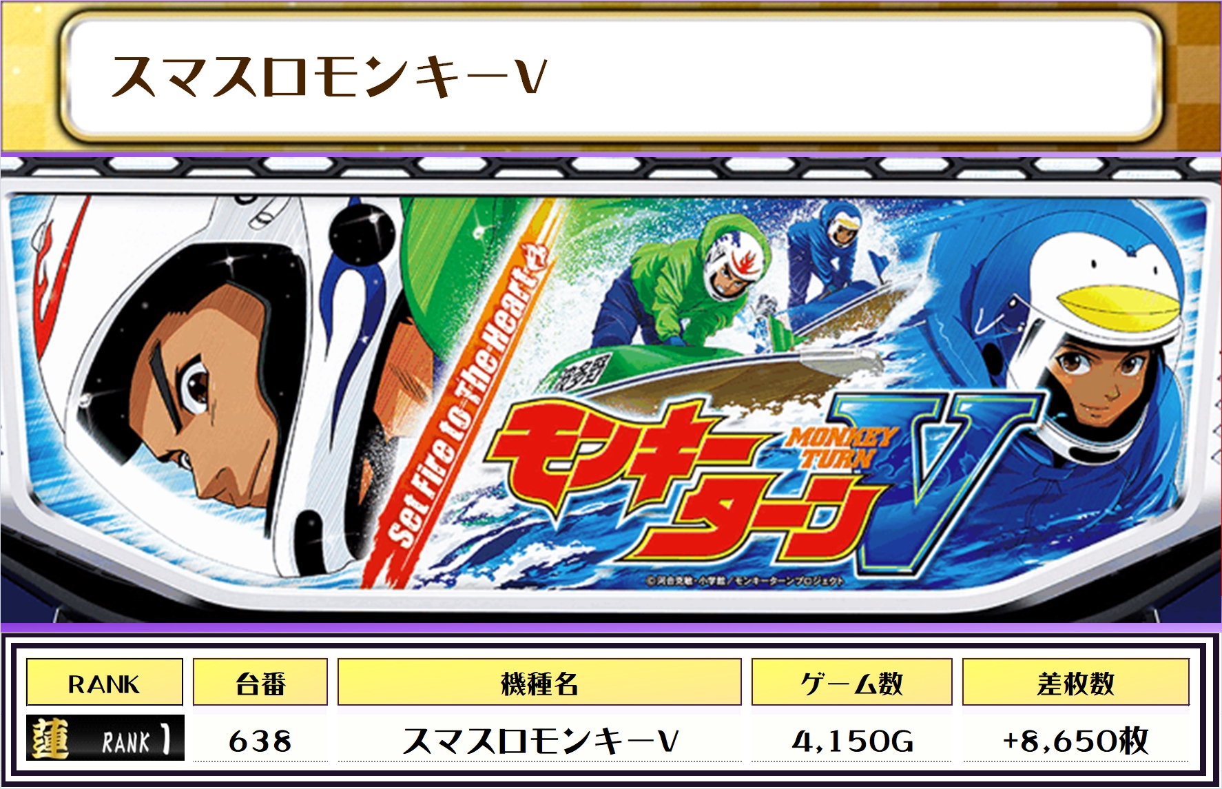 全体のTOPは【スマスロモンキーV・638番台】で+8,650枚‼️