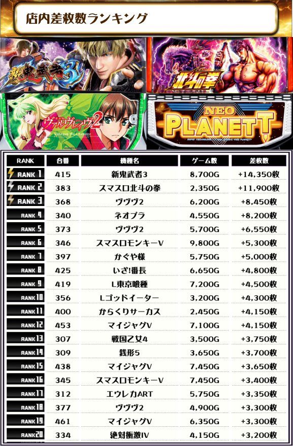 2位には【スマスロ北斗の拳・383番台】の+11,900枚、そして3位には【ヴヴヴ2・368番台】の+8,450枚がランクインっ💥💥💥💥💥