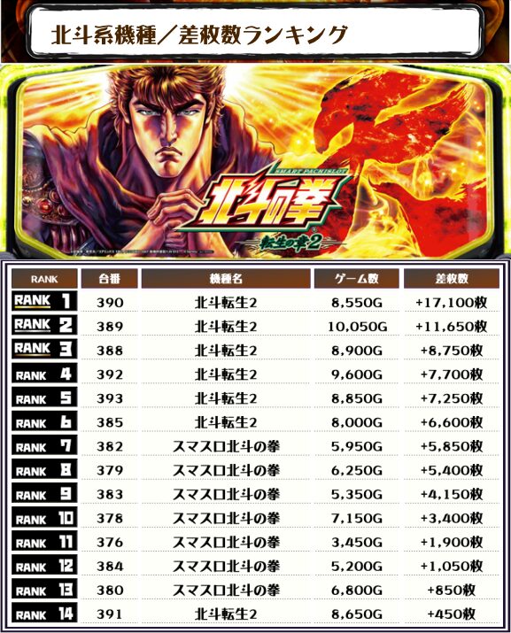 また、2位には【北斗転生2・389番台】の+11,650枚、そして3位には【北斗転生2・388番台】の+8,750枚がランクインしました🏆