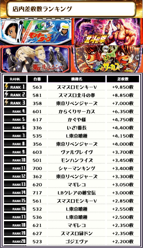 2位には【スマスロ北斗の拳・581番台】の+8,850枚、3位には【東京リベンジャーズ・358番台】の+7,000枚がランクイン💥💥💥💥💥