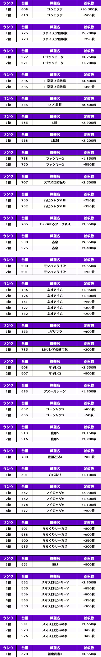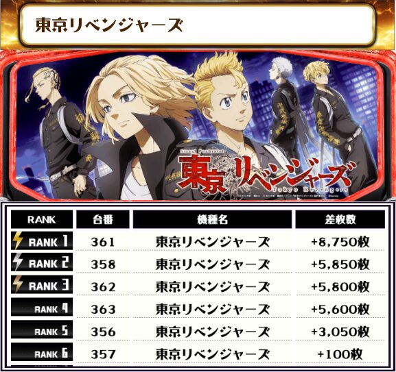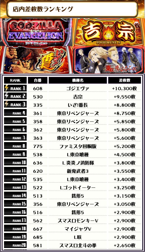 2位には【吉宗・530番台】の+9,550枚、3位には【いざ!番長・335番台】の+8,800枚がランクイン💥💥💥💥💥