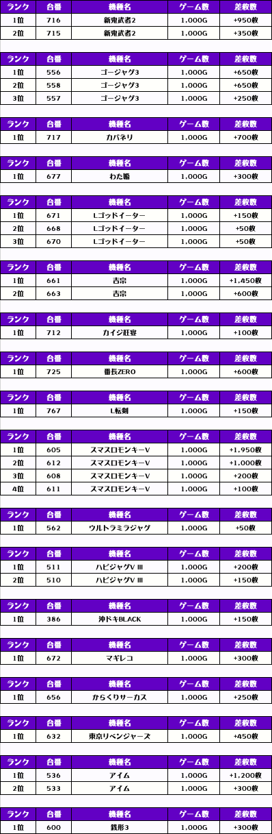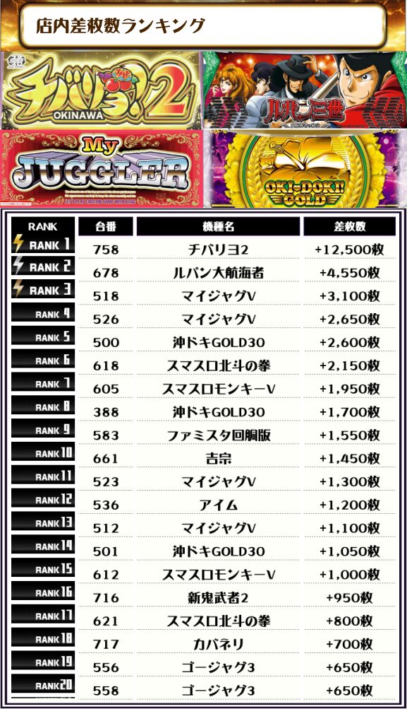 2位には【ルパン大航海者・678番台】の+4,550枚、3位には【マイジャグ5・518番台】の+3,100枚がランクイン💥💥💥💥💥