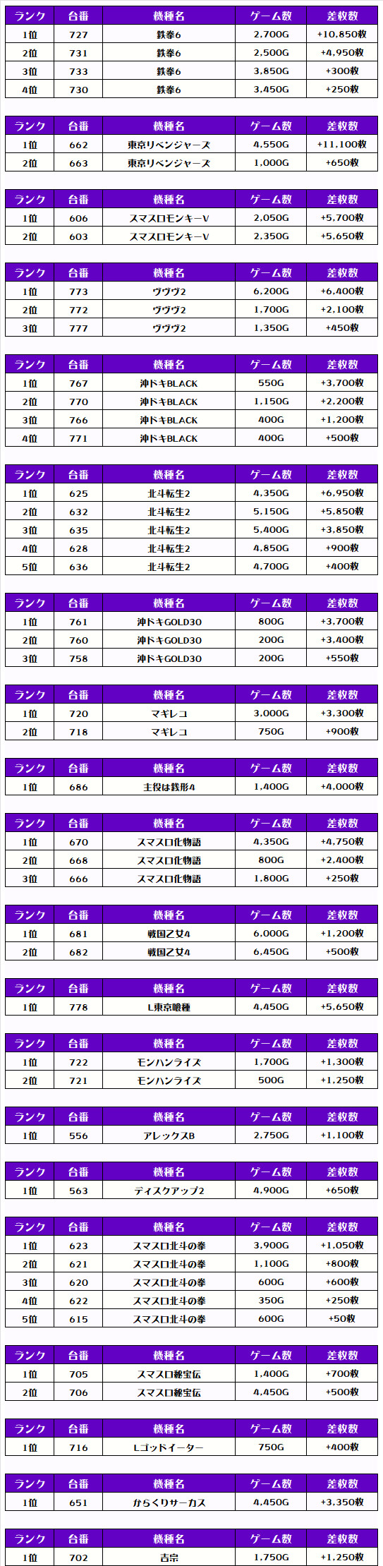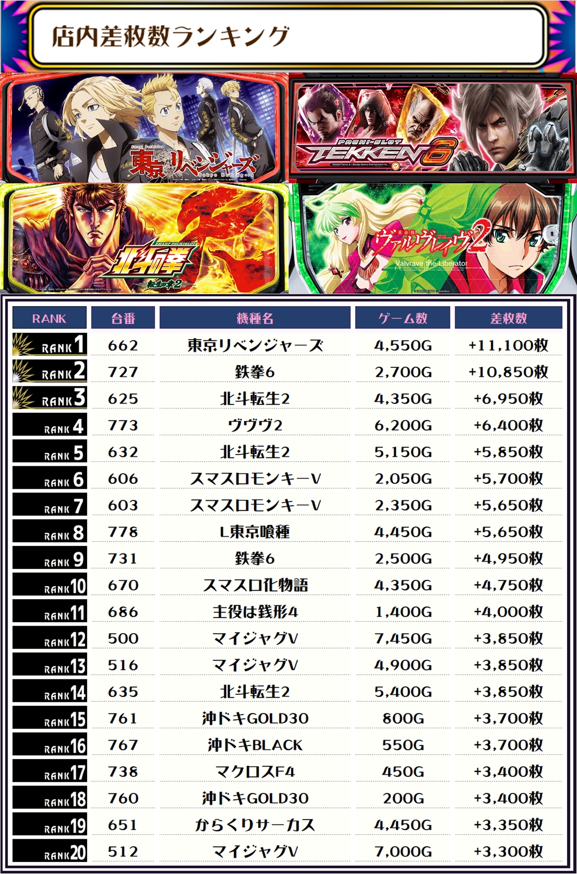 続く2位には【鉄拳6・727番台】の+10,850枚、3位は【北斗転生2・625番台】の+6,950枚がランクインですっ❗️