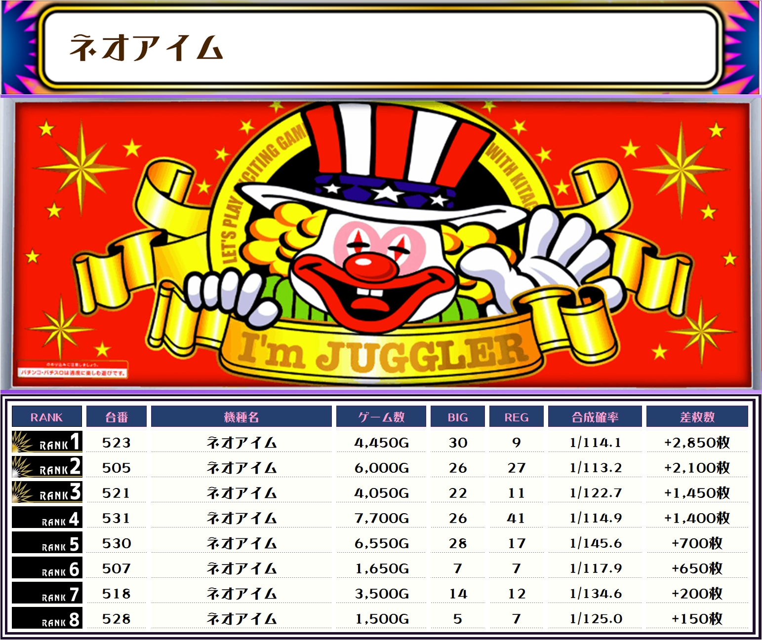 ランキングにマイジャグが3台もランクイン🔥🔥🔥マイジャグは19台中10台がプラスで平均差枚が約842枚、ネオアイムも勝率が良く、14台中8台がプラスで平均差枚が約550枚と優秀な結果となりました👏👏👏