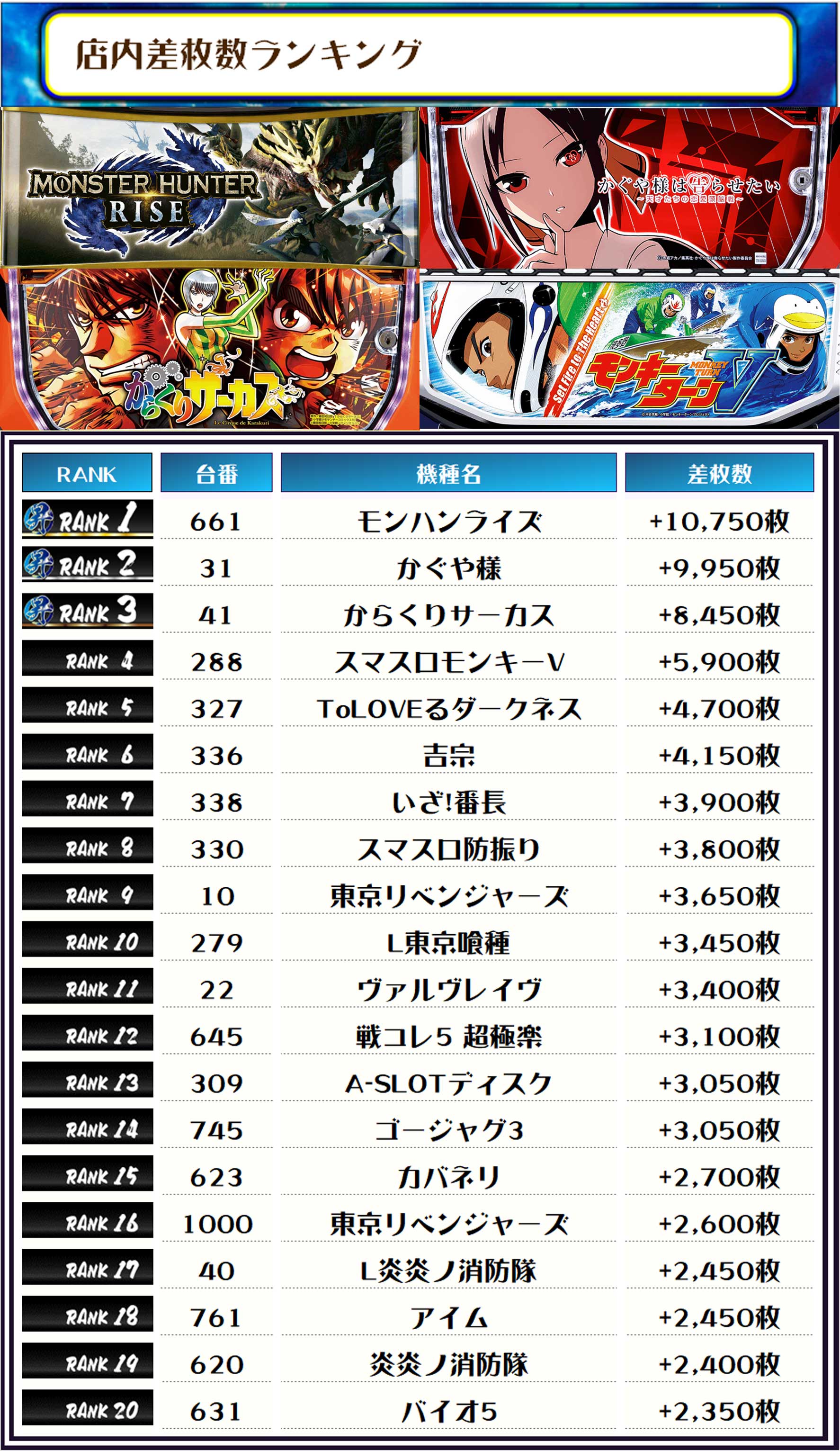 全体差枚のトップは【モンハンライズ・661番台】で+10,750枚🔥🔥🔥