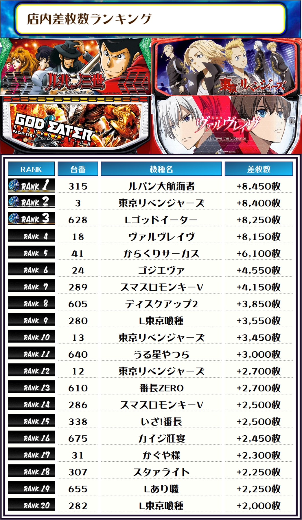 全体差枚のトップは【ルパン大航海者・315番台】で+8,450枚🔥🔥🔥