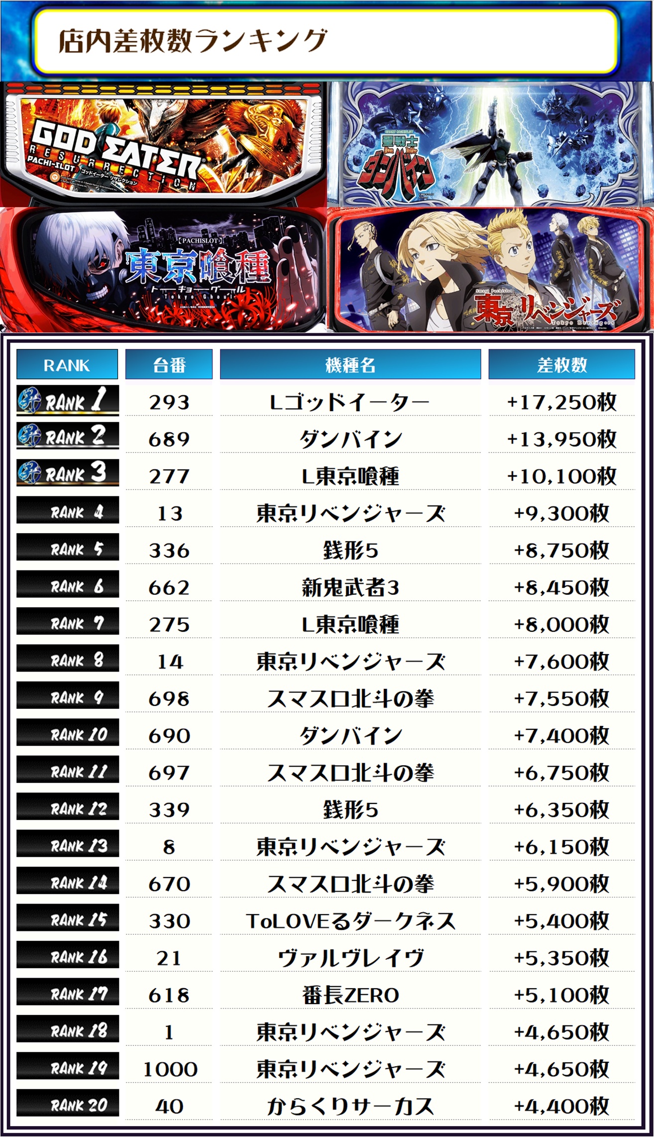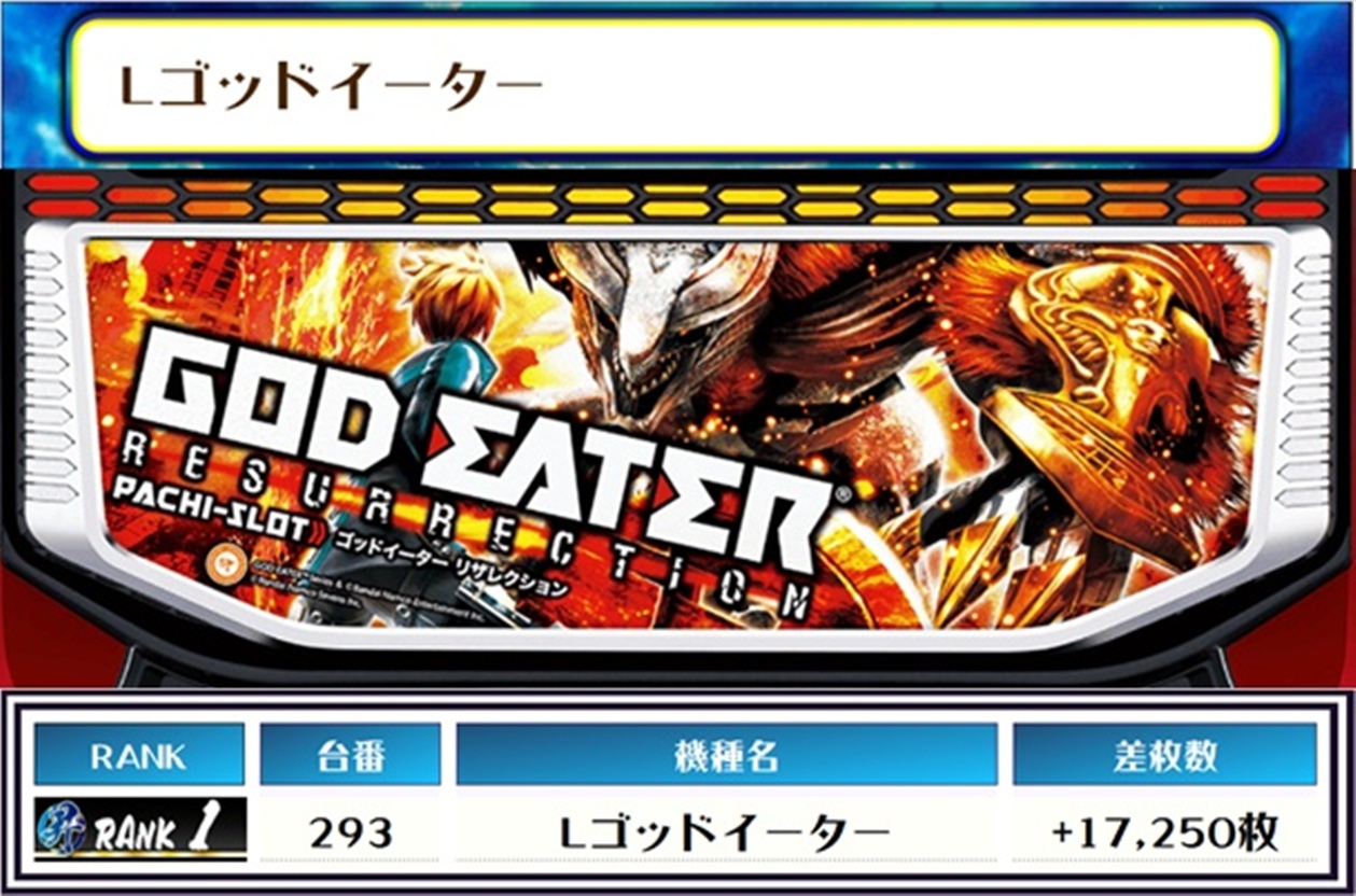 全体差枚のトップは【Lゴッドイーター・293番台】で+17,250枚🔥🔥🔥