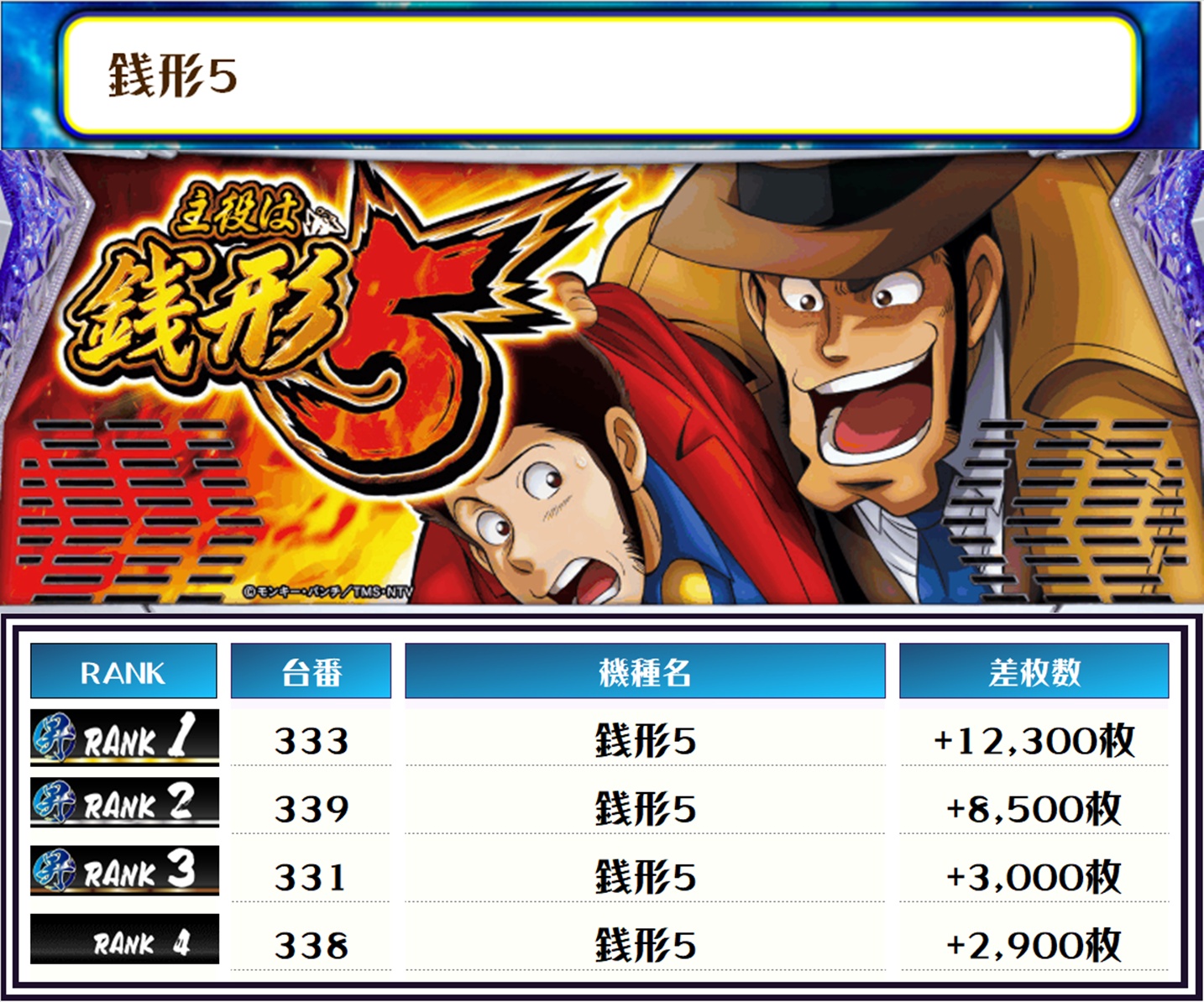 全体差枚のトップは【銭形5・333番台】で+12,300枚🔥🔥🔥