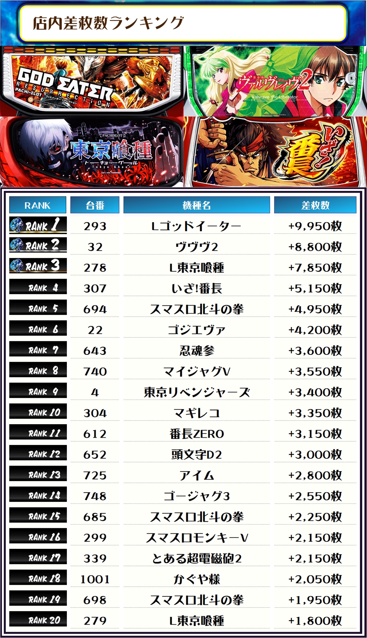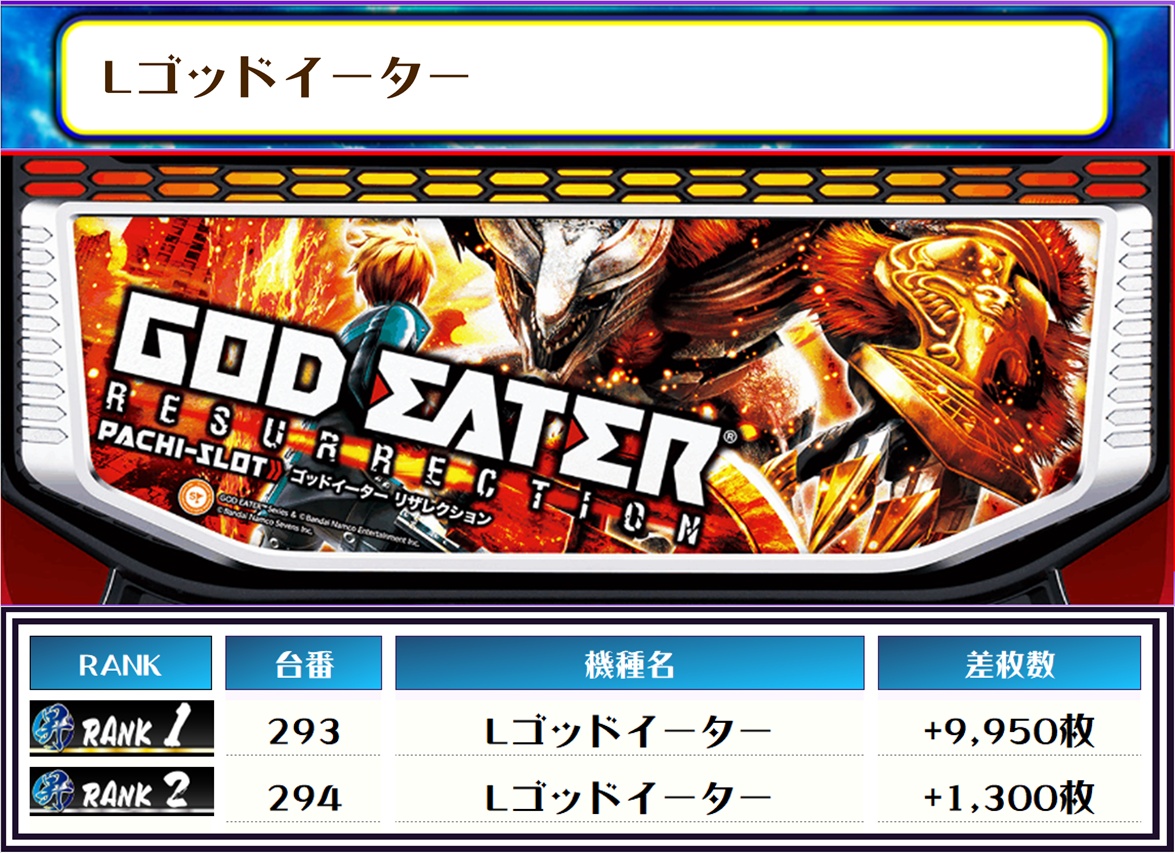 全体差枚のトップはLゴッドイーター・293番台】で+9,950枚👍