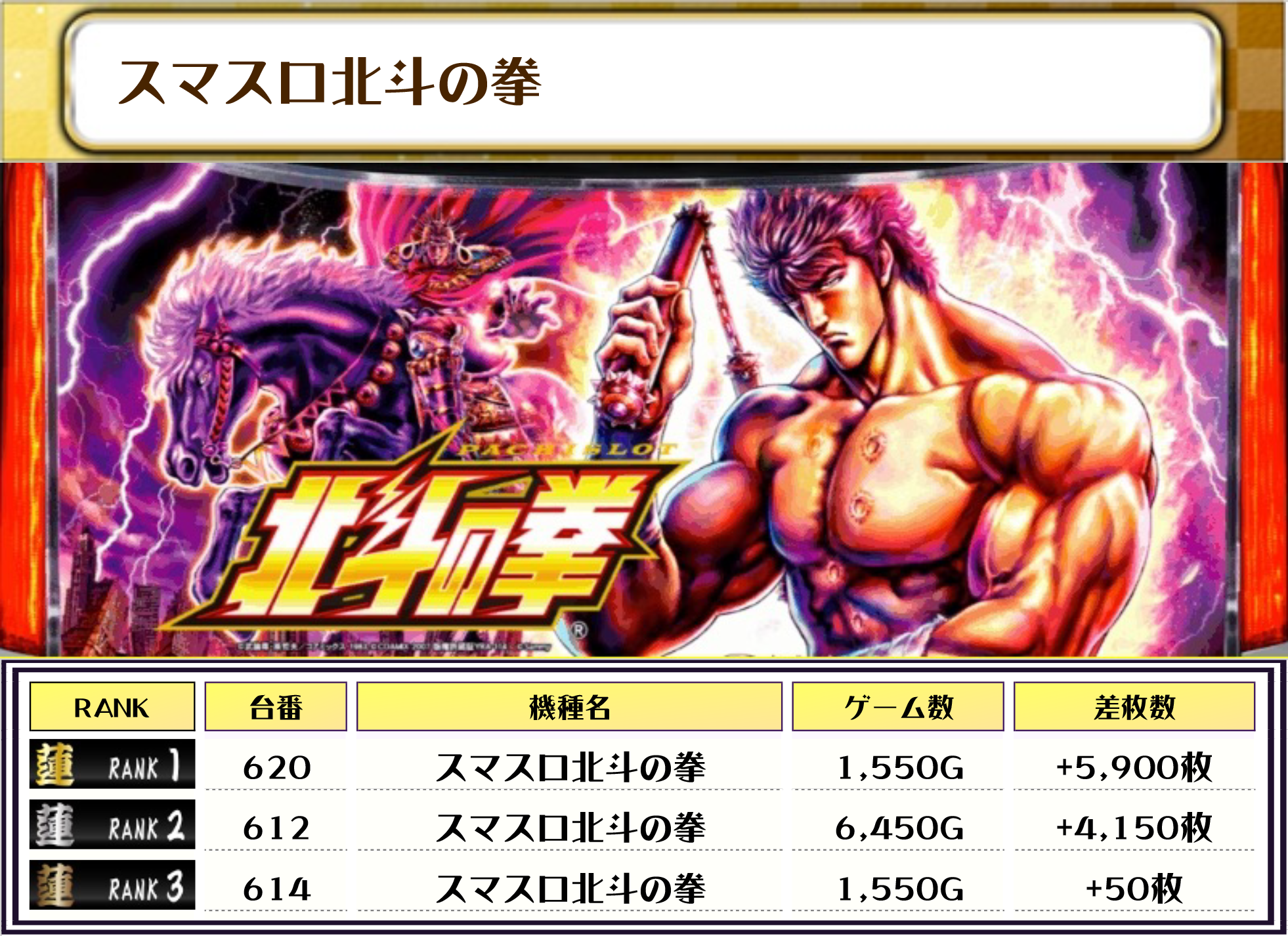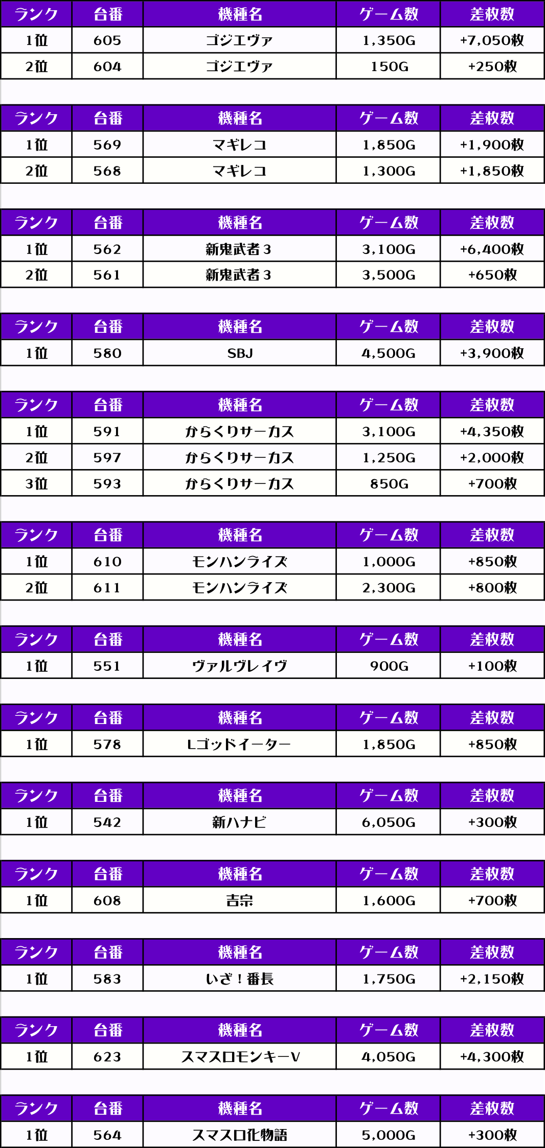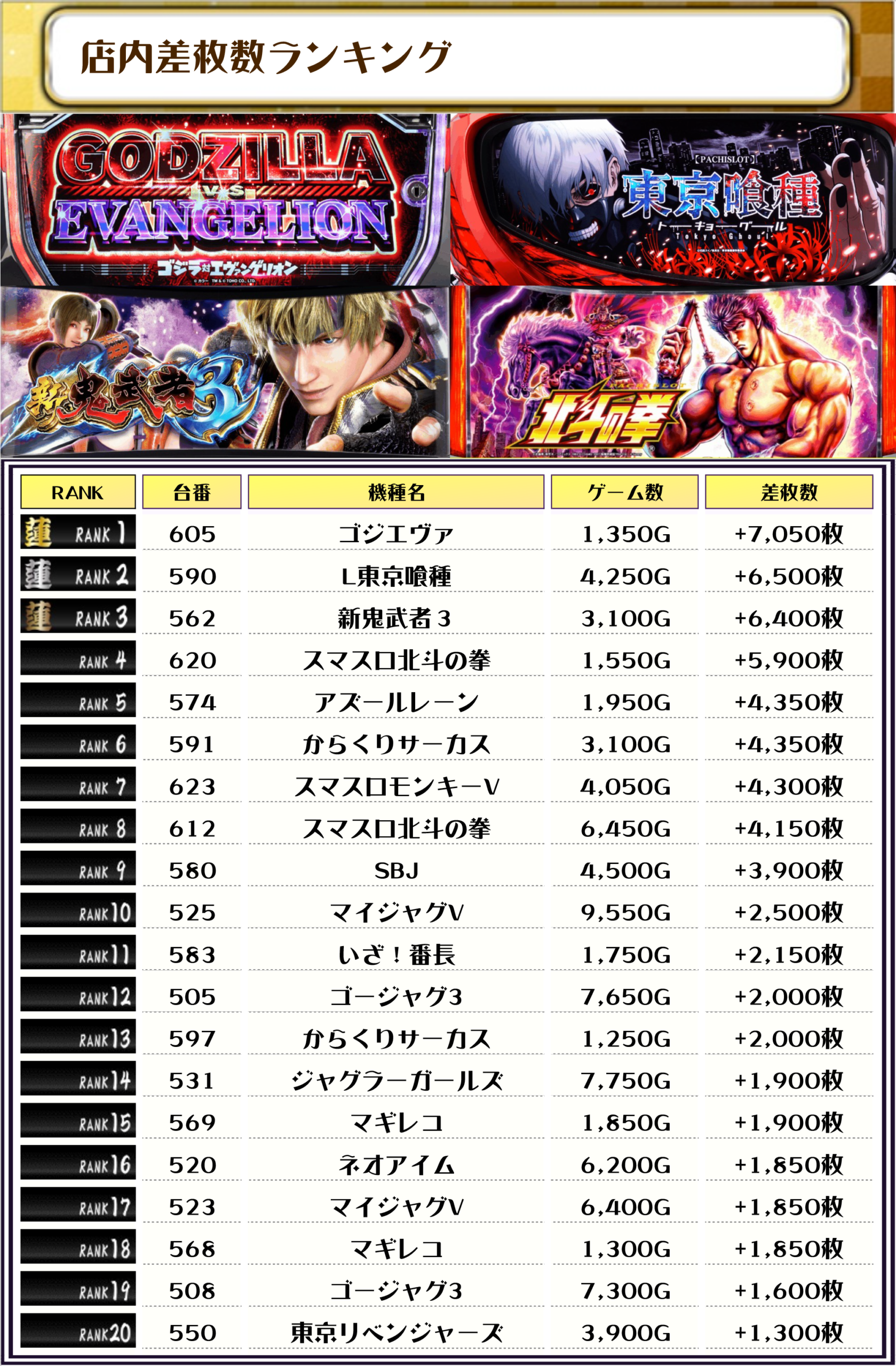 2位には【L東京喰種・590番台】の+6,500枚、そして3位には【新鬼武者3・562番台】の+6,400枚がランクインっ🏆🏆🏆🏆