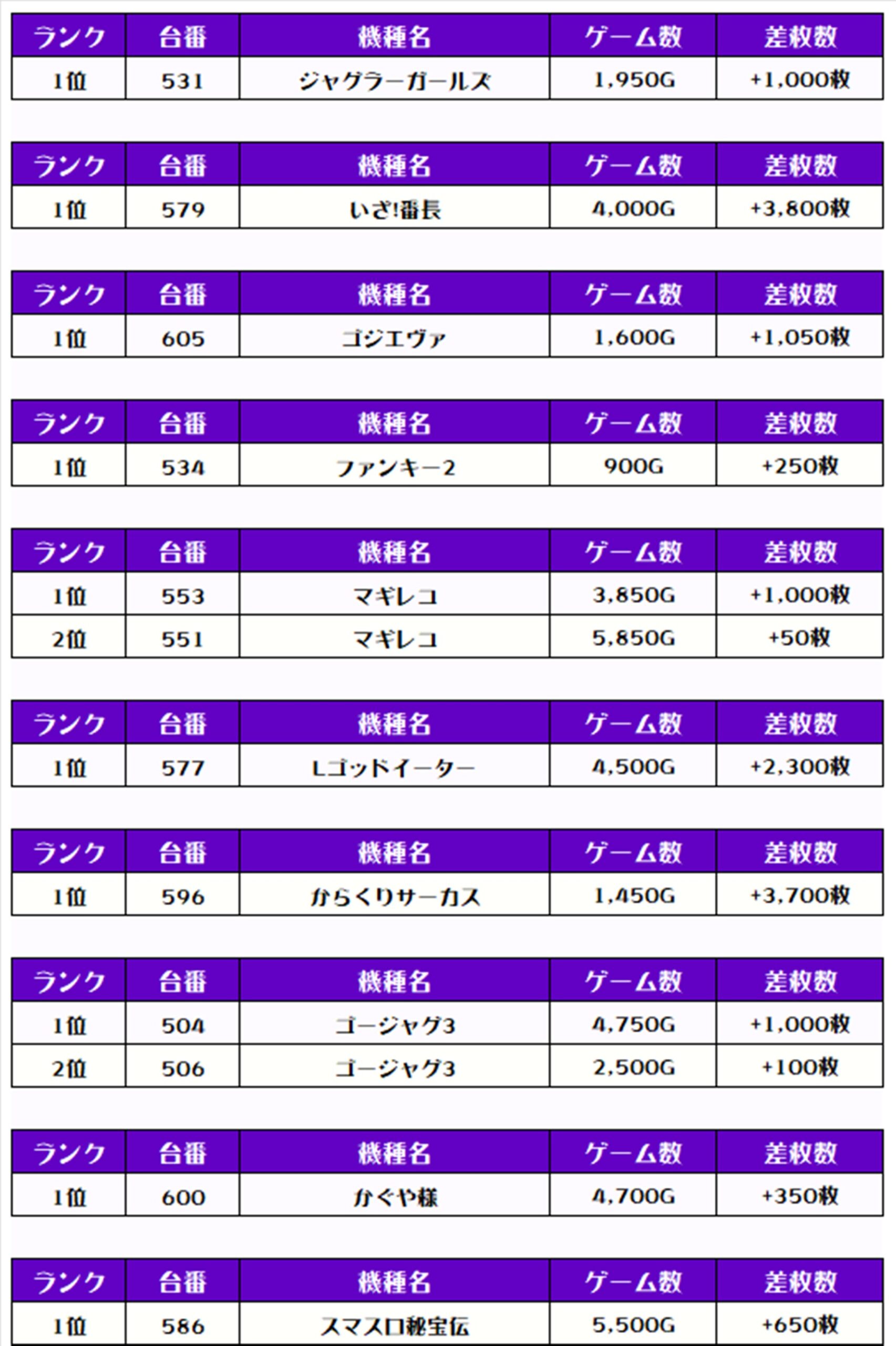 また、この日の注目台差枚ランキングがこちら❗️