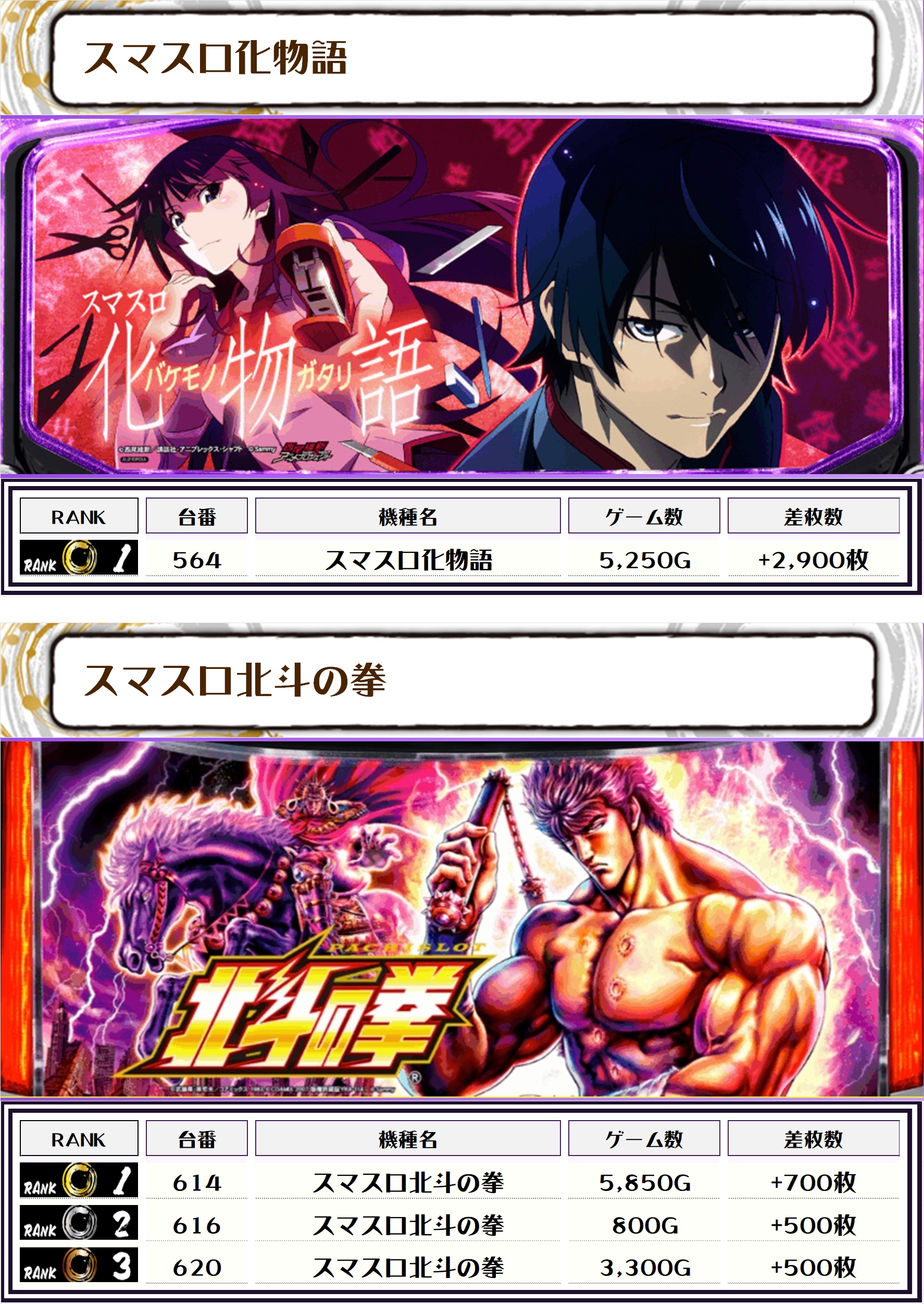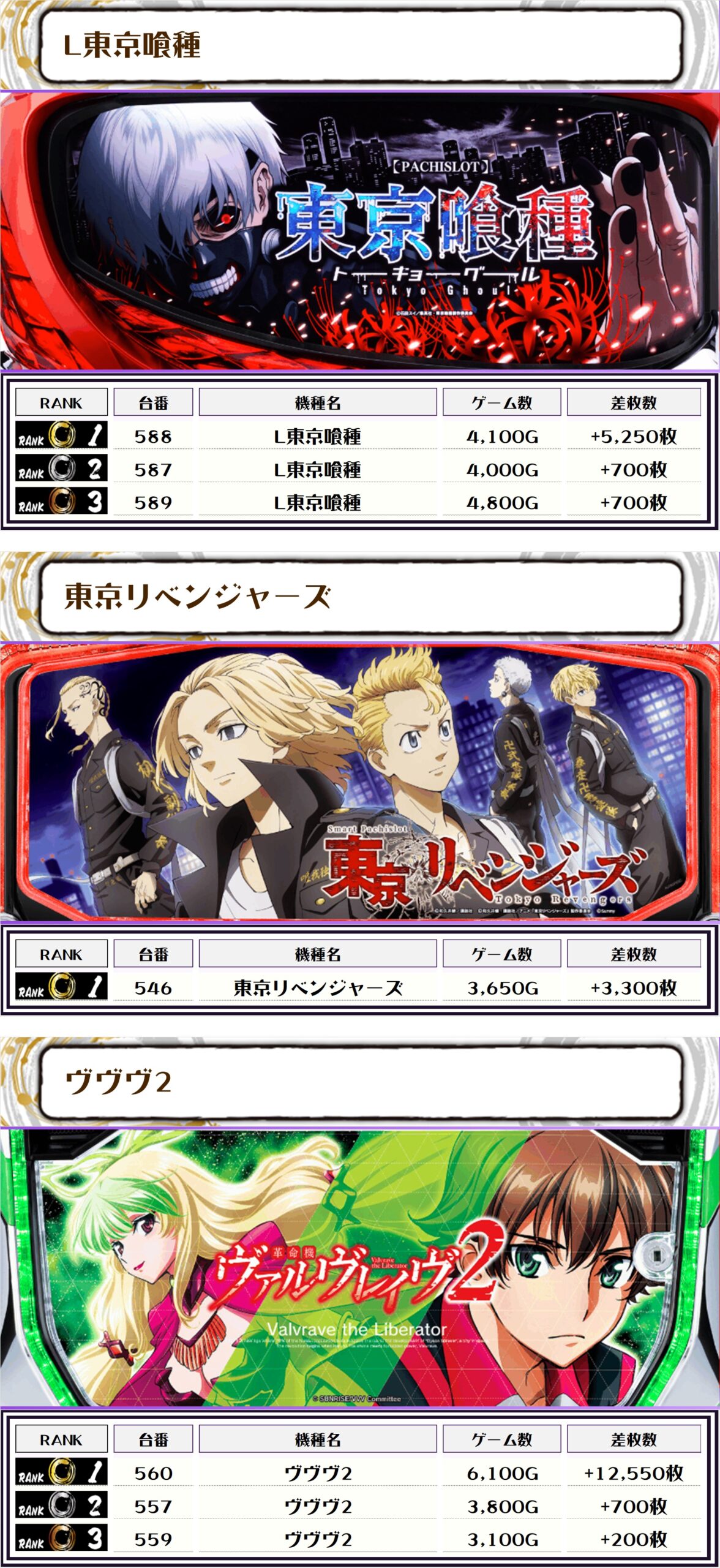 2位には【L東京喰種・588番台】の+5,250枚、3位には【いざ!番長・579番台】の+3,800枚がランクインっ🏆
