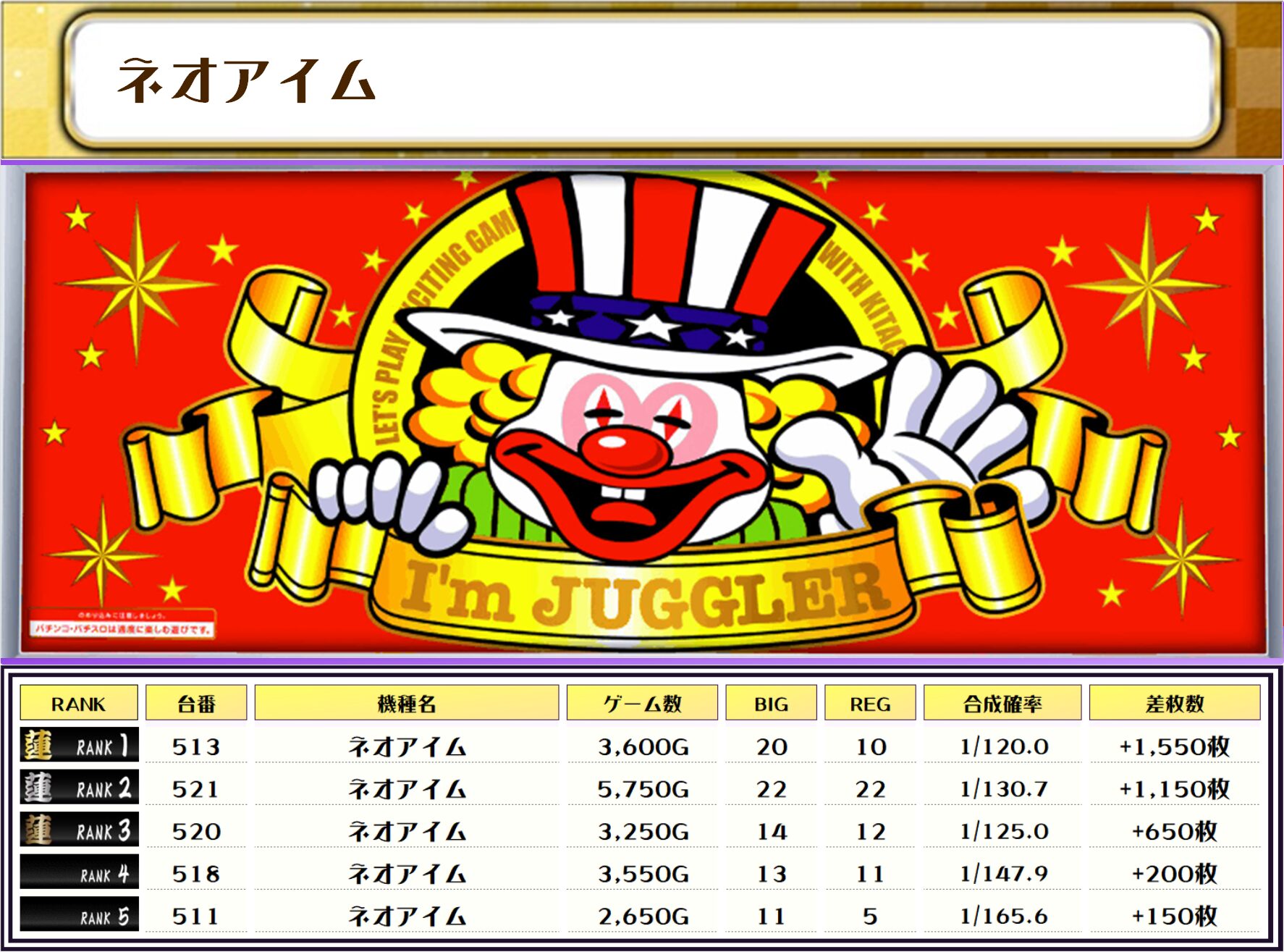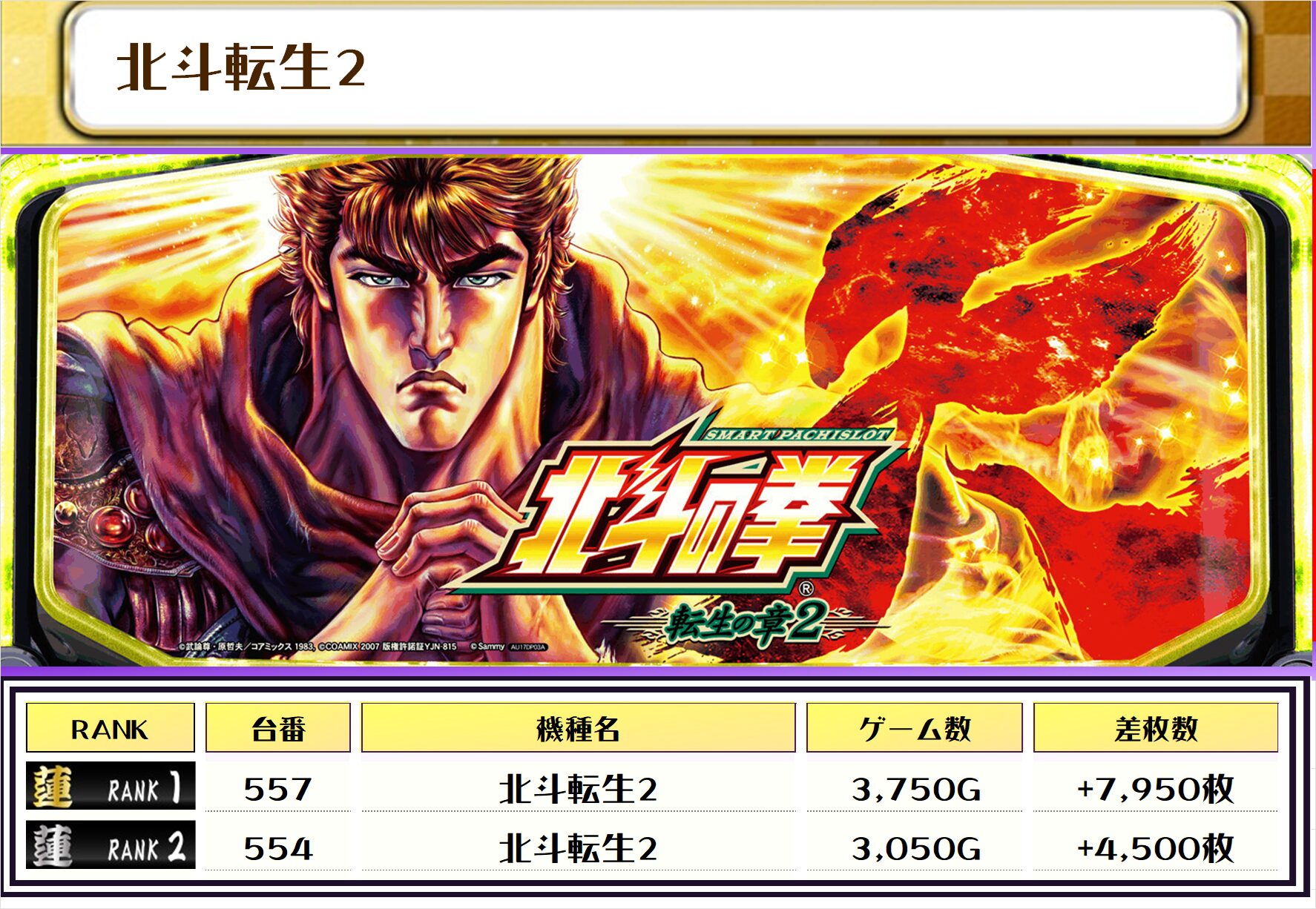この日、全体の差枚トップに輝いたのは【北斗転生2・557番台】で+7,950枚‼️