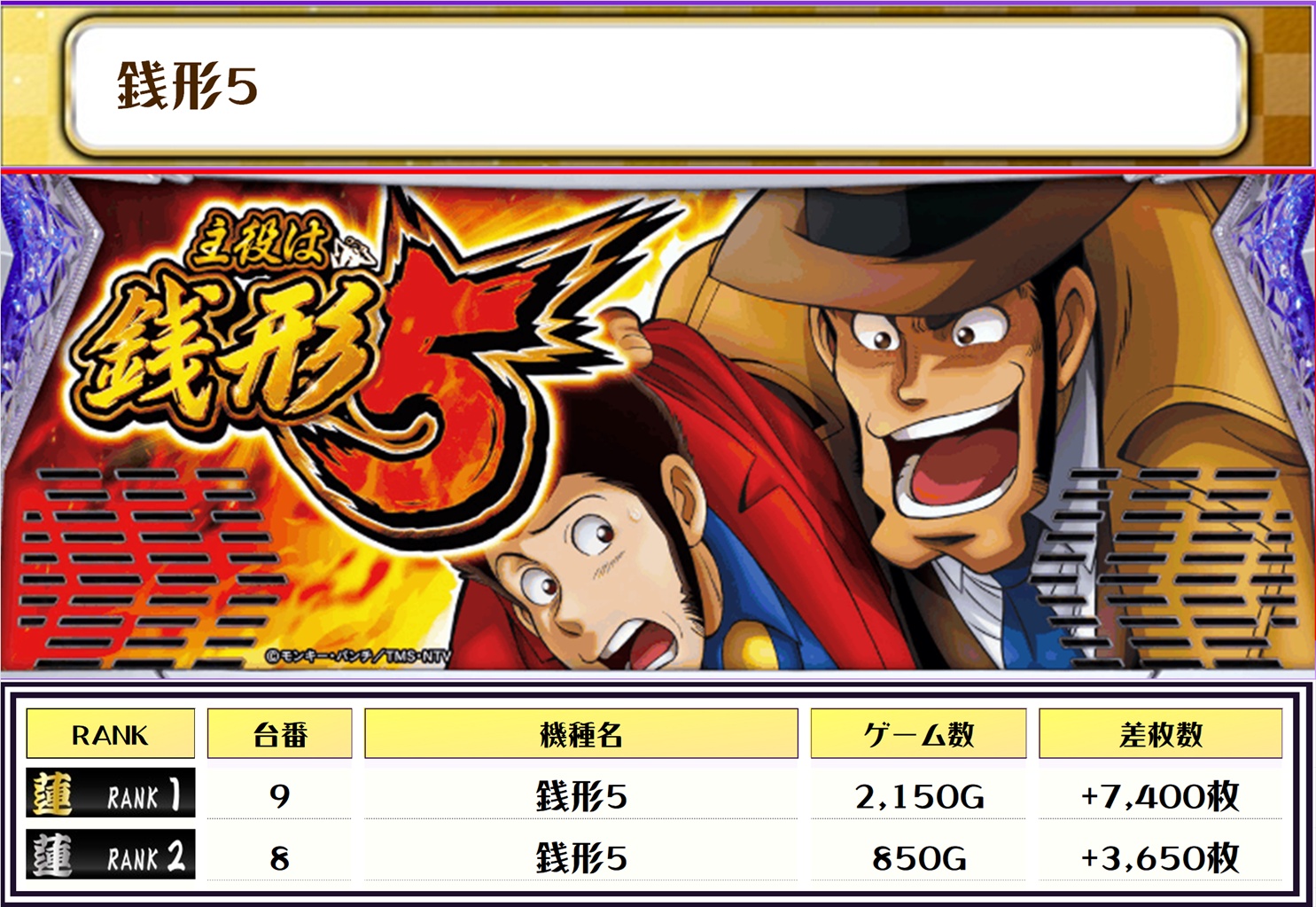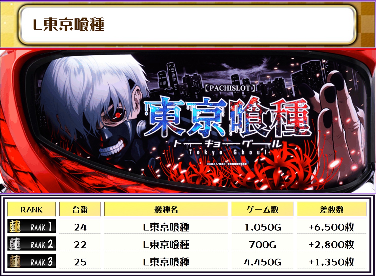 2位には【銭形5・9番台】の+7,400枚、そして3位には【L東京喰種・24番台】の+6,500枚がランクインしました✨