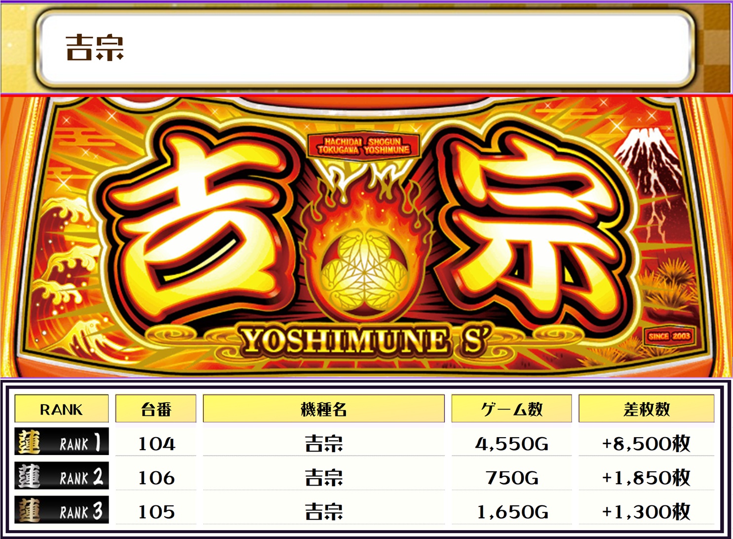 全体差枚のトップは【吉宗・104番台】で+8,500枚っ❗️