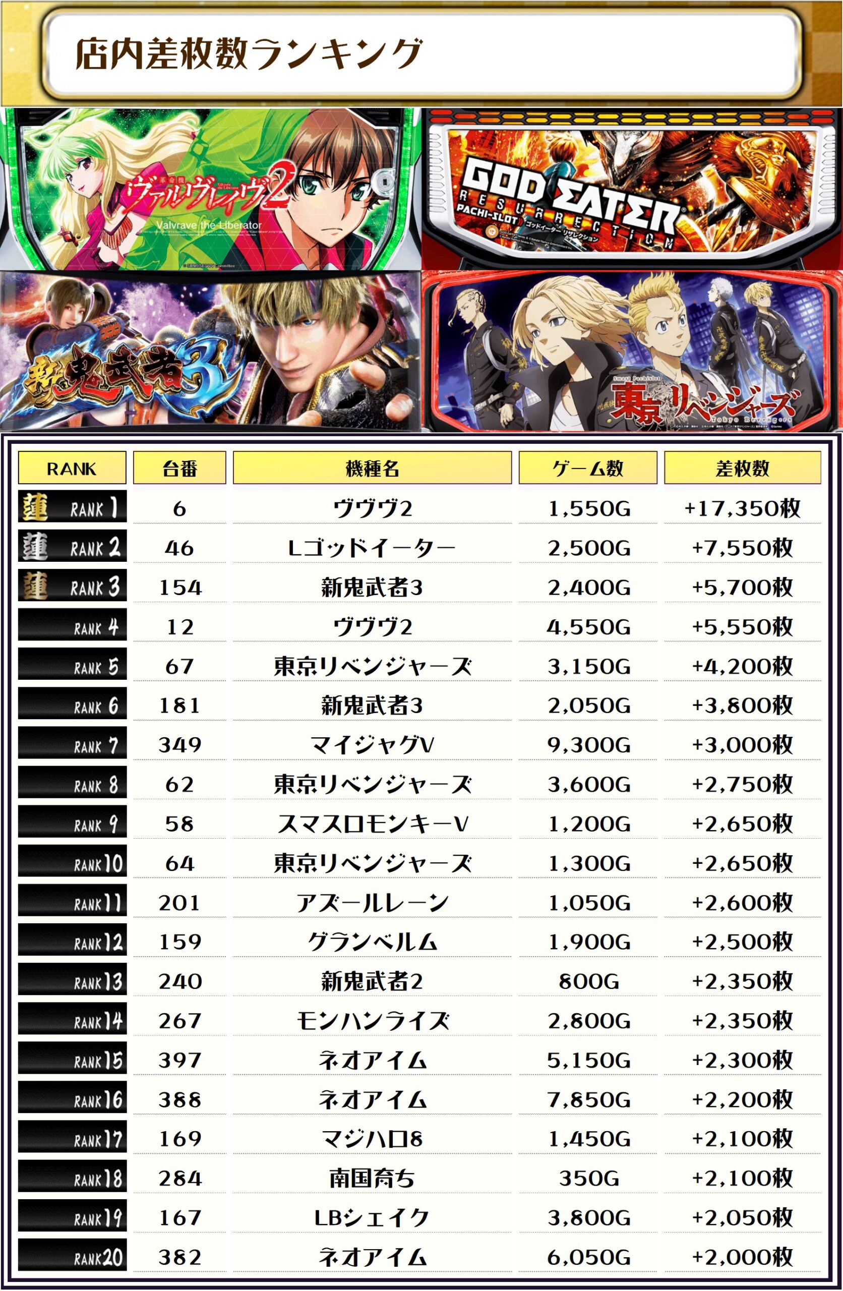 全体差枚のトップは【ヴヴヴ2・6番台】で+17,350枚っ❗️