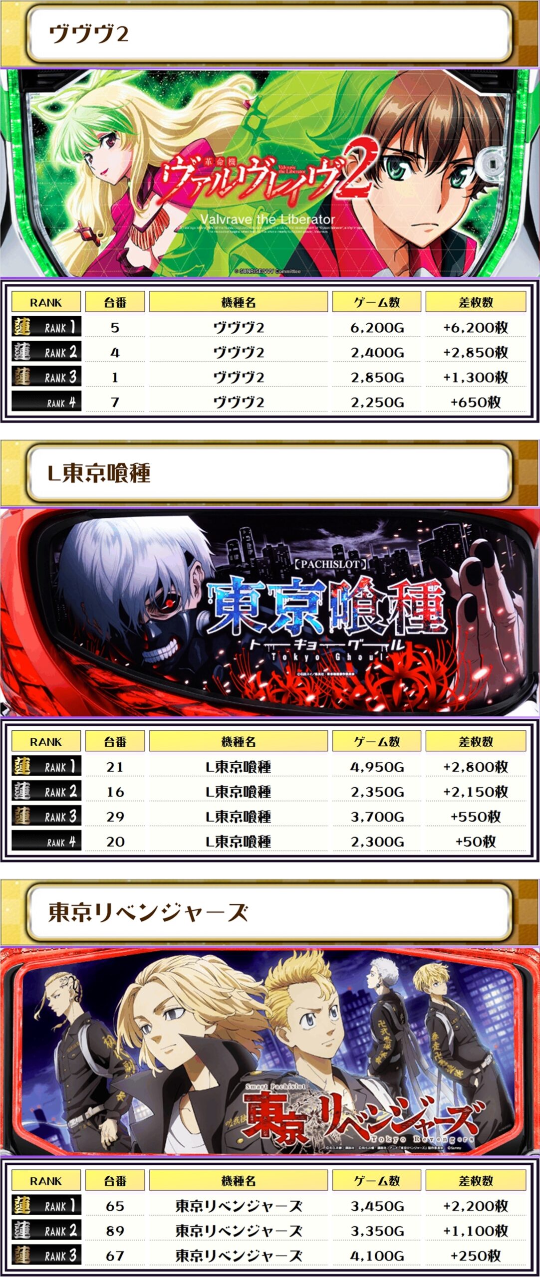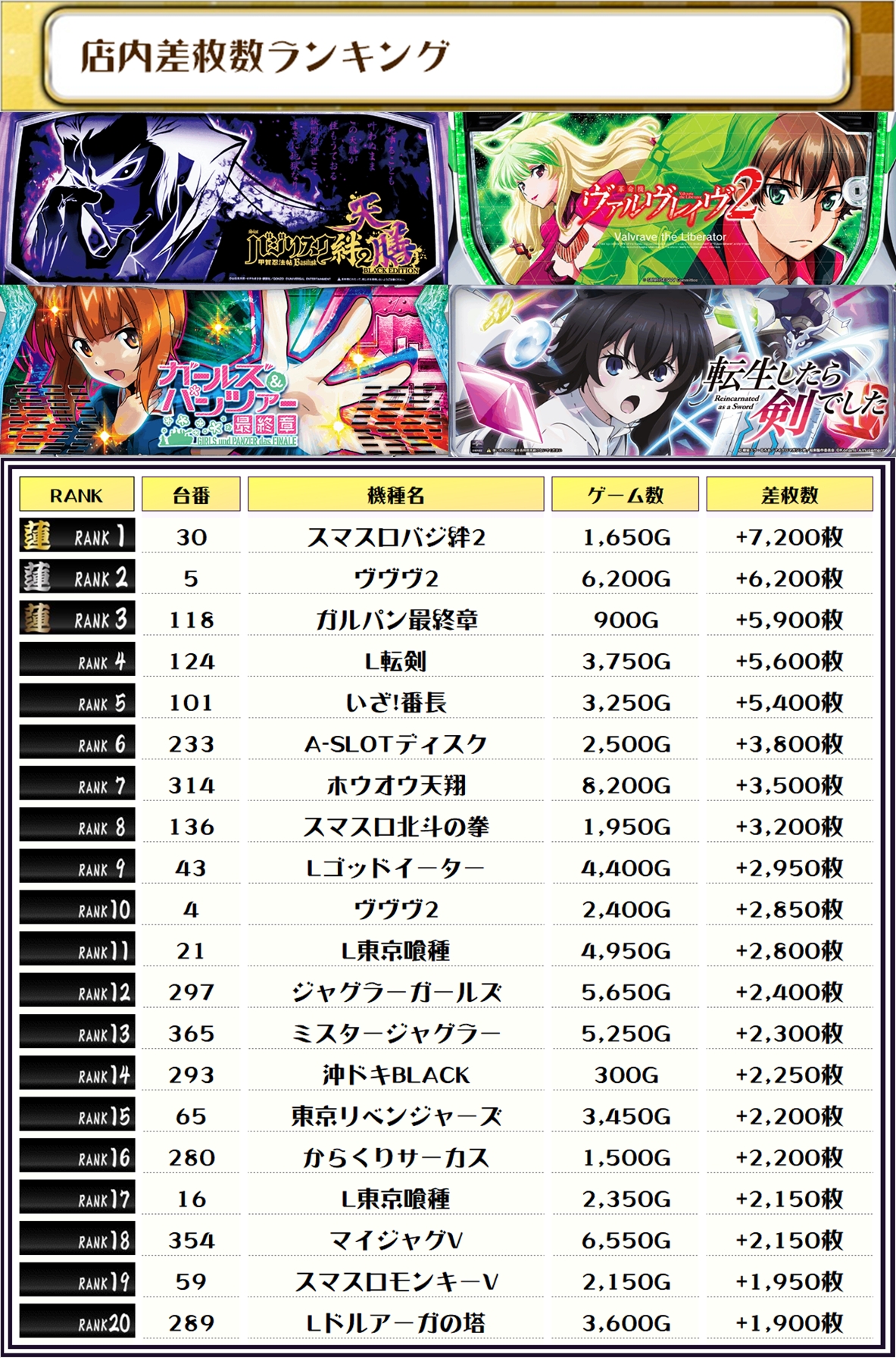 2位には【ヴヴヴ2・5番台】の+6,200枚、3位には【ガルパン最終章・118番台】の+5,900枚がランクインしました✨