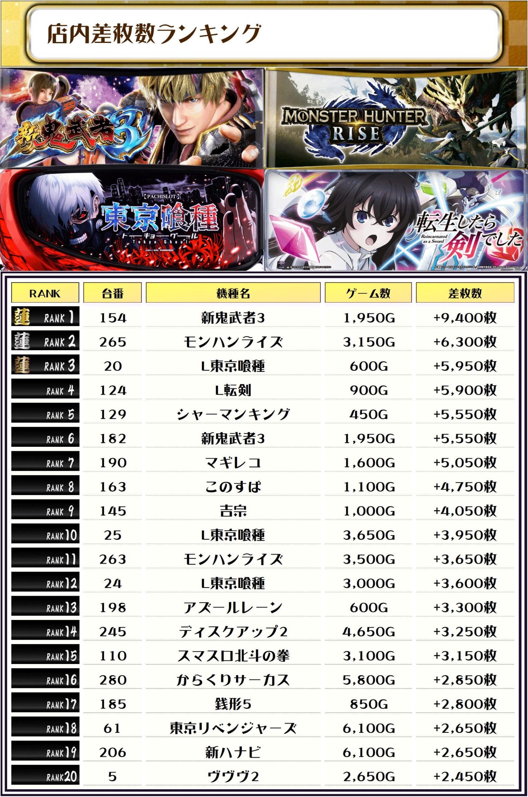 全体差枚のトップは【新鬼武者3・154番台】の+9,400枚っ❗️