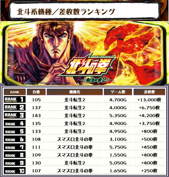 また、2位には【北斗転生2・137番台】の+6,750枚、そして3位には【北斗転生2・143番台】の+4,200枚がランクインしました🏆