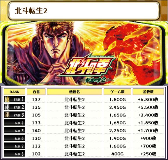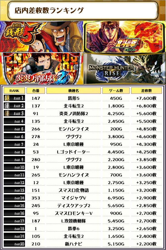 2位には【北斗転生2・137番台】の+6,800枚、そして3位には【炎炎ノ市消防隊2・91番台】の+5,600枚がランクインしました✨