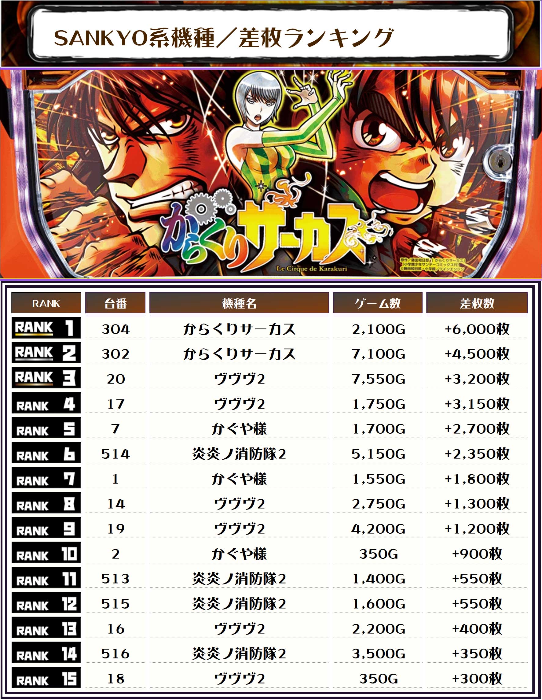 続く2位にも同じく【からくりサーカス・302番台】の+4,500枚、そして3位には【ヴヴヴ2・20番台】の+3,200枚がランクインですっ❗️